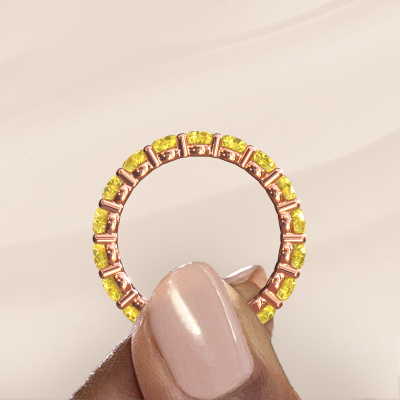 Das ist unser Heddy rnd 3.4-Ring. Dieser spezielle Typ wird als eternity Ring bezeichnet und ist mit einer durchgehenden Linie von identisch geschliffenen Edelsteinen besetzt. Er ist aus 14 Karat Roségold und mit kleineren 3.4 mm Gelb Saphir besetzt. Die erstaunlichen Gelb Saphir sind identisch in der Größe und im Ringband platziert. Unsere Gelb Saphir werden sorgfältig ausgewählt, damit sie identisch sind und somit das beste Ergebnis erzielen. Um das beste Ergebnis zu erzielen, positioniert unser Juwelier alle Gelb Saphir von Hand und mit größter Sorgfalt. Unsere Juweliere haben nur ein Ziel, nämlich den perfekten Ring zu kreieren. Deshalb lieben wir, was wir tun. Am Ende bekommen Sie einen atemberaubenden, moderne Roségold Ring mit einer Reihe von Gelb Saphir, die weder Anfang noch Ende zu haben scheinen. Das perfekte Symbol für Ihre unsterbliche Liebe zu ihr! Ist sie nicht eine Schönheit? Nach Erhalt Ihrer Bestellung beginnen unsere Goldschmiede mit Leidenschaft den kreativen Prozess und fertigen Ihren Ring in unserem eigenen Studio. Da wir keine großen Lager haben, werden diese Kosten nicht an Sie weitergegeben. Unsere Preisgestaltung ist der Beweis dafür! Wir bieten Schmuck zum niedrigsten Preis, garantiert.Unsere talentierten, leidenschaftlichen Designer fügen unserer Online-Kollektion täglich neue Designs hinzu. Zusammen versuchen sie, eine vielfältige Kollektion feinster Schmuckstücke zu erstellen. Wenn Sie es vorziehen, einen Ring nach Ihrem eigenen Entwurf zu machen, können Sie gerne ein Angebot anfordern. Wir machen Ihnen ein großartiges Angebot, basierend auf Qualität und Preis.Um es einfacher zu machen, bieten wir eine kostenlose 30-tägige Rücksendung.