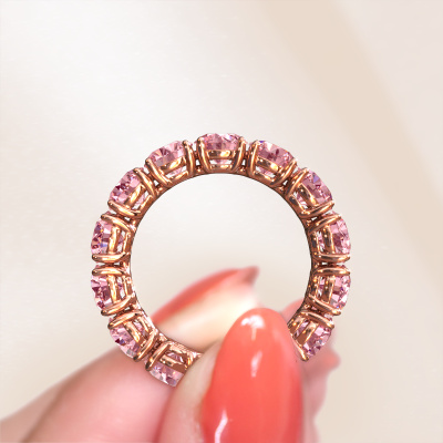 Das ist unser Vivienne 5.0-Ring. Dieser spezielle Typ wird als eternity Ring bezeichnet und ist mit einer durchgehenden Linie von identisch geschliffenen Edelsteinen besetzt. Er ist aus 14 Karat Roségold und mit kleineren 5 mm rosa Labordiamanten besetzt. Die erstaunlichen rosa Labordiamanten sind identisch in der Größe und im Ringband platziert. Unsere rosa Labordiamanten werden sorgfältig ausgewählt, damit sie identisch sind und somit das beste Ergebnis erzielen. Um das beste Ergebnis zu erzielen, positioniert unser Juwelier alle rosa Labordiamanten von Hand und mit größter Sorgfalt. Unsere Juweliere haben nur ein Ziel, nämlich den perfekten Ring zu kreieren. Deshalb lieben wir, was wir tun. Am Ende bekommen Sie einen atemberaubenden, exklusive Roségold Ring mit einer Reihe von rosa Labordiamanten, die weder Anfang noch Ende zu haben scheinen. Das perfekte Symbol für Ihre unsterbliche Liebe zu ihr! Ist sie nicht eine Schönheit? Mit unserer modernen Technik können wir Schmuckstücke von höchster Qualität mit größter Sorgfalt für Sie entwerfen und anpassen. Unsere Ringe sind immer um 30 Prozent günstiger als bei anderen Juwelieren. Wir fertigen Ringe auf Bestellung, also müssen wir keine großen Lager unterhalten. Wenn Sie ein bestimmtes Budget haben, beraten wir Sie gerne entsprechend.Unsere Online-Kollektion wird täglich um neue Schmuckdesigns ergänzt. Unser Team von leidenschaftlichen Designern ist bemüht, außergewöhnliche und vielfältige Designs zu kreieren. Haben Sie einen Ring gesehen, der Ihnen gefällt? Setzen Sie sich mit uns in Verbindung. Basierend auf einem guten Preis/Leistungsverhältnis machen wir Ihnen ein Angebot, das Sie nicht ablehnen können!Um es einfacher zu machen, bieten wir eine kostenlose 30-tägige Rücksendung.
