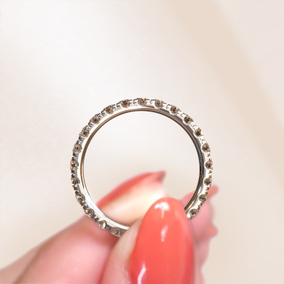 Das ist unser Jackie 2.3-Ring. Dieser spezielle Typ wird als eternity Ring bezeichnet und ist mit einer durchgehenden Linie von identisch geschliffenen Edelsteinen besetzt. Er ist aus 14 Karat Weißgold und mit kleineren 0.05 crt Braune Diamanten besetzt. Die erstaunlichen Braune Diamanten sind identisch in der Größe und im Ringband platziert. Unsere Braune Diamanten werden sorgfältig ausgewählt, damit sie identisch sind und somit das beste Ergebnis erzielen. Um das beste Ergebnis zu erzielen, positioniert unser Juwelier alle Braune Diamanten von Hand und mit größter Sorgfalt. Unsere Juweliere haben nur ein Ziel, nämlich den perfekten Ring zu kreieren. Deshalb lieben wir, was wir tun. Am Ende bekommen Sie einen atemberaubenden, moderne Weißgold Ring mit einer Reihe von Braune Diamanten, die weder Anfang noch Ende zu haben scheinen. Das perfekte Symbol für Ihre unsterbliche Liebe zu ihr! Ist sie nicht eine Schönheit? Haben Sie ein bestimmtes Budget? Sie können uns gerne kontaktieren, damit wir Ihre Optionen besprechen können. Wir bieten unsere Ringe zum garantiert besten Preis, denn wir fertigen sie auf Bestellung. Solche Preise finden Sie nirgendwo anders!Unser Team von talentierten, leidenschaftlichen Designern fügt unserer Online-Kollektion täglich neue Ring-Designs hinzu. Unser Ziel dabei ist es, Ihnen eine große Vielfalt an Schmuckstücken anbieten zu können. Bitte zögern Sie nicht, ein Angebot anzufordern, wenn Sie spezielle Wünsche für Ihren Ring haben. Wir garantieren Ihnen ein Angebot, das Sie nicht ablehnen können.Um es einfacher zu machen, bieten wir eine kostenlose 30-tägige Rücksendung.