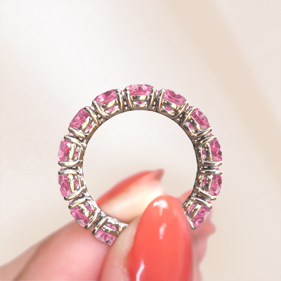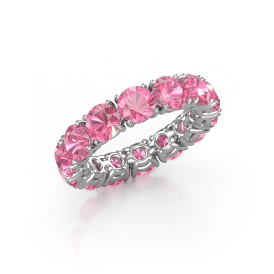 Das ist unser Vivienne 5.0-Ring. Dieser spezielle Typ wird als eternity Ring bezeichnet und ist mit einer durchgehenden Linie von identisch geschliffenen Edelsteinen besetzt. Er ist aus 14 Karat Weißgold und mit kleineren 5 mm Pink Saphir besetzt. Die erstaunlichen Pink Saphir sind identisch in der Größe und im Ringband platziert. Unsere Pink Saphir werden sorgfältig ausgewählt, damit sie identisch sind und somit das beste Ergebnis erzielen. Um das beste Ergebnis zu erzielen, positioniert unser Juwelier alle Pink Saphir von Hand und mit größter Sorgfalt. Unsere Juweliere haben nur ein Ziel, nämlich den perfekten Ring zu kreieren. Deshalb lieben wir, was wir tun. Am Ende bekommen Sie einen atemberaubenden, exklusive Weißgold Ring mit einer Reihe von Pink Saphir, die weder Anfang noch Ende zu haben scheinen. Das perfekte Symbol für Ihre unsterbliche Liebe zu ihr! Ist sie nicht eine Schönheit? Mit unserer modernen Technik können wir Schmuckstücke von höchster Qualität mit größter Sorgfalt für Sie entwerfen und anpassen. Unsere Ringe sind immer um 30 Prozent günstiger als bei anderen Juwelieren. Wir fertigen Ringe auf Bestellung, also müssen wir keine großen Lager unterhalten. Wenn Sie ein bestimmtes Budget haben, beraten wir Sie gerne entsprechend.Unsere Online-Kollektion wird täglich um neue Schmuckdesigns ergänzt. Unser Team von leidenschaftlichen Designern ist bemüht, außergewöhnliche und vielfältige Designs zu kreieren. Haben Sie einen Ring gesehen, der Ihnen gefällt? Setzen Sie sich mit uns in Verbindung. Basierend auf einem guten Preis/Leistungsverhältnis machen wir Ihnen ein Angebot, das Sie nicht ablehnen können!Um es einfacher zu machen, bieten wir eine kostenlose 30-tägige Rücksendung.
