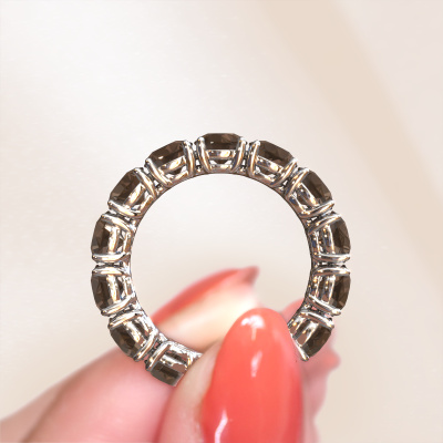 Das ist unser Vivienne 5.0-Ring. Dieser spezielle Typ wird als eternity Ring bezeichnet und ist mit einer durchgehenden Linie von identisch geschliffenen Edelsteinen besetzt. Er ist aus 14 Karat Weißgold und mit kleineren 5 mm Rauchquarz besetzt. Die erstaunlichen Rauchquarz sind identisch in der Größe und im Ringband platziert. Unsere Rauchquarz werden sorgfältig ausgewählt, damit sie identisch sind und somit das beste Ergebnis erzielen. Um das beste Ergebnis zu erzielen, positioniert unser Juwelier alle Rauchquarz von Hand und mit größter Sorgfalt. Unsere Juweliere haben nur ein Ziel, nämlich den perfekten Ring zu kreieren. Deshalb lieben wir, was wir tun. Am Ende bekommen Sie einen atemberaubenden, exklusive Weißgold Ring mit einer Reihe von Rauchquarz, die weder Anfang noch Ende zu haben scheinen. Das perfekte Symbol für Ihre unsterbliche Liebe zu ihr! Ist sie nicht eine Schönheit? Mit unserer modernen Technik können wir Schmuckstücke von höchster Qualität mit größter Sorgfalt für Sie entwerfen und anpassen. Unsere Ringe sind immer um 30 Prozent günstiger als bei anderen Juwelieren. Wir fertigen Ringe auf Bestellung, also müssen wir keine großen Lager unterhalten. Wenn Sie ein bestimmtes Budget haben, beraten wir Sie gerne entsprechend.Unsere Online-Kollektion wird täglich um neue Schmuckdesigns ergänzt. Unser Team von leidenschaftlichen Designern ist bemüht, außergewöhnliche und vielfältige Designs zu kreieren. Haben Sie einen Ring gesehen, der Ihnen gefällt? Setzen Sie sich mit uns in Verbindung. Basierend auf einem guten Preis/Leistungsverhältnis machen wir Ihnen ein Angebot, das Sie nicht ablehnen können!Um es einfacher zu machen, bieten wir eine kostenlose 30-tägige Rücksendung.