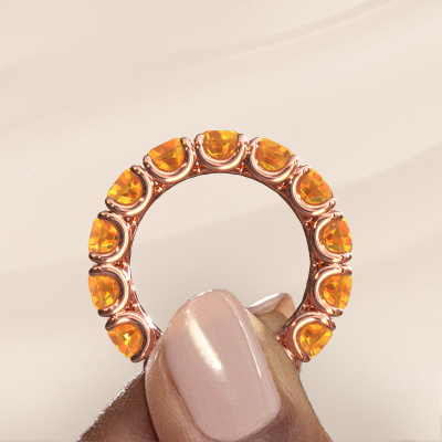 Das ist unser Estee 5.0-Ring. Dieser spezielle Typ wird als eternity Ring bezeichnet und ist mit einer durchgehenden Linie von identisch geschliffenen Edelsteinen besetzt. Er ist aus 14 Karat Roségold und mit kleineren 5 mm Citrin besetzt. Die erstaunlichen Citrin sind identisch in der Größe und im Ringband platziert. Unsere Citrin werden sorgfältig ausgewählt, damit sie identisch sind und somit das beste Ergebnis erzielen. Um das beste Ergebnis zu erzielen, positioniert unser Juwelier alle Citrin von Hand und mit größter Sorgfalt. Unsere Juweliere haben nur ein Ziel, nämlich den perfekten Ring zu kreieren. Deshalb lieben wir, was wir tun. Am Ende bekommen Sie einen atemberaubenden, exklusive Roségold Ring mit einer Reihe von Citrin, die weder Anfang noch Ende zu haben scheinen. Das perfekte Symbol für Ihre unsterbliche Liebe zu ihr! Ist sie nicht eine Schönheit? Haben Sie ein bestimmtes Budget? Sie können uns gerne kontaktieren, damit wir Ihre Optionen besprechen können. Wir bieten unsere Ringe zum garantiert besten Preis, denn wir fertigen sie auf Bestellung. Solche Preise finden Sie nirgendwo anders!Unsere talentierten, leidenschaftlichen Designer fügen unserer Online-Kollektion täglich neue Designs hinzu. Zusammen versuchen sie, eine vielfältige Kollektion feinster Schmuckstücke zu erstellen. Wenn Sie es vorziehen, einen Ring nach Ihrem eigenen Entwurf zu machen, können Sie gerne ein Angebot anfordern. Wir machen Ihnen ein großartiges Angebot, basierend auf Qualität und Preis.Um es einfacher zu machen, bieten wir eine kostenlose 30-tägige Rücksendung.