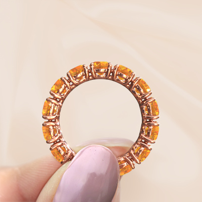 Das ist unser Vivienne 4.7-Ring. Dieser spezielle Typ wird als eternity Ring bezeichnet und ist mit einer durchgehenden Linie von identisch geschliffenen Edelsteinen besetzt. Er ist aus 14 Karat Roségold und mit kleineren 4.7 mm Citrin besetzt. Die erstaunlichen Citrin sind identisch in der Größe und im Ringband platziert. Unsere Citrin werden sorgfältig ausgewählt, damit sie identisch sind und somit das beste Ergebnis erzielen. Um das beste Ergebnis zu erzielen, positioniert unser Juwelier alle Citrin von Hand und mit größter Sorgfalt. Unsere Juweliere haben nur ein Ziel, nämlich den perfekten Ring zu kreieren. Deshalb lieben wir, was wir tun. Am Ende bekommen Sie einen atemberaubenden, exklusive Roségold Ring mit einer Reihe von Citrin, die weder Anfang noch Ende zu haben scheinen. Das perfekte Symbol für Ihre unsterbliche Liebe zu ihr! Ist sie nicht eine Schönheit? Nach Erhalt Ihrer Bestellung beginnen unsere Goldschmiede mit Leidenschaft den kreativen Prozess und fertigen Ihren Ring in unserem eigenen Studio. Da wir keine großen Lager haben, werden diese Kosten nicht an Sie weitergegeben. Unsere Preisgestaltung ist der Beweis dafür! Wir bieten Schmuck zum niedrigsten Preis, garantiert.Unsere talentierten, leidenschaftlichen Designer fügen unserer Online-Kollektion täglich neue Designs hinzu. Zusammen versuchen sie, eine vielfältige Kollektion feinster Schmuckstücke zu erstellen. Wenn Sie es vorziehen, einen Ring nach Ihrem eigenen Entwurf zu machen, können Sie gerne ein Angebot anfordern. Wir machen Ihnen ein großartiges Angebot, basierend auf Qualität und Preis.Um es einfacher zu machen, bieten wir eine kostenlose 30-tägige Rücksendung.