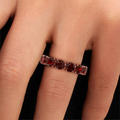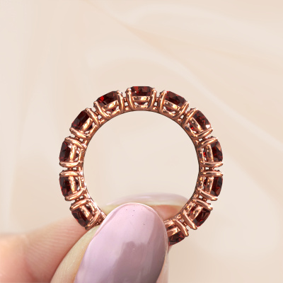 Das ist unser Vivienne 4.7-Ring. Dieser spezielle Typ wird als eternity Ring bezeichnet und ist mit einer durchgehenden Linie von identisch geschliffenen Edelsteinen besetzt. Er ist aus 14 Karat Roségold und mit kleineren 4.7 mm Granat besetzt. Die erstaunlichen Granat sind identisch in der Größe und im Ringband platziert. Unsere Granat werden sorgfältig ausgewählt, damit sie identisch sind und somit das beste Ergebnis erzielen. Um das beste Ergebnis zu erzielen, positioniert unser Juwelier alle Granat von Hand und mit größter Sorgfalt. Unsere Juweliere haben nur ein Ziel, nämlich den perfekten Ring zu kreieren. Deshalb lieben wir, was wir tun. Am Ende bekommen Sie einen atemberaubenden, exklusive Roségold Ring mit einer Reihe von Granat, die weder Anfang noch Ende zu haben scheinen. Das perfekte Symbol für Ihre unsterbliche Liebe zu ihr! Ist sie nicht eine Schönheit? Nach Erhalt Ihrer Bestellung beginnen unsere Goldschmiede mit Leidenschaft den kreativen Prozess und fertigen Ihren Ring in unserem eigenen Studio. Da wir keine großen Lager haben, werden diese Kosten nicht an Sie weitergegeben. Unsere Preisgestaltung ist der Beweis dafür! Wir bieten Schmuck zum niedrigsten Preis, garantiert.Unsere talentierten, leidenschaftlichen Designer fügen unserer Online-Kollektion täglich neue Designs hinzu. Zusammen versuchen sie, eine vielfältige Kollektion feinster Schmuckstücke zu erstellen. Wenn Sie es vorziehen, einen Ring nach Ihrem eigenen Entwurf zu machen, können Sie gerne ein Angebot anfordern. Wir machen Ihnen ein großartiges Angebot, basierend auf Qualität und Preis.Um es einfacher zu machen, bieten wir eine kostenlose 30-tägige Rücksendung.