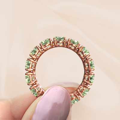 Das ist unser Vivienne 4.7-Ring. Dieser spezielle Typ wird als eternity Ring bezeichnet und ist mit einer durchgehenden Linie von identisch geschliffenen Edelsteinen besetzt. Er ist aus 14 Karat Roségold und mit kleineren 4.7 mm grüner Labor-Diamanten besetzt. Die erstaunlichen grüner Labor-Diamanten sind identisch in der Größe und im Ringband platziert. Unsere grüner Labor-Diamanten werden sorgfältig ausgewählt, damit sie identisch sind und somit das beste Ergebnis erzielen. Um das beste Ergebnis zu erzielen, positioniert unser Juwelier alle grüner Labor-Diamanten von Hand und mit größter Sorgfalt. Unsere Juweliere haben nur ein Ziel, nämlich den perfekten Ring zu kreieren. Deshalb lieben wir, was wir tun. Am Ende bekommen Sie einen atemberaubenden, exklusive Roségold Ring mit einer Reihe von grüner Labor-Diamanten, die weder Anfang noch Ende zu haben scheinen. Das perfekte Symbol für Ihre unsterbliche Liebe zu ihr! Ist sie nicht eine Schönheit?