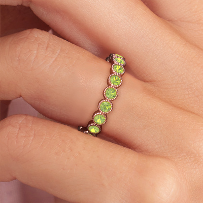 Das ist unser Mariam 0.05-Ring. Dieser spezielle Typ wird als eternity Ring bezeichnet und ist mit einer durchgehenden Linie von identisch geschliffenen Edelsteinen besetzt. Er ist aus 14 Karat Roségold und mit kleineren 2.4 mm Peridot besetzt. Die erstaunlichen Peridot sind identisch in der Größe und im Ringband platziert. Unsere Peridot werden sorgfältig ausgewählt, damit sie identisch sind und somit das beste Ergebnis erzielen. Um das beste Ergebnis zu erzielen, positioniert unser Juwelier alle Peridot von Hand und mit größter Sorgfalt. Unsere Juweliere haben nur ein Ziel, nämlich den perfekten Ring zu kreieren. Deshalb lieben wir, was wir tun. Am Ende bekommen Sie einen atemberaubenden, moderne Roségold Ring mit einer Reihe von Peridot, die weder Anfang noch Ende zu haben scheinen. Das perfekte Symbol für Ihre unsterbliche Liebe zu ihr! Ist sie nicht eine Schönheit? Durch die Kombination modernster Technik mit uralter Handwerkskunst können wir alle Ringe in unserem eigenen Studio anfertigen. Jedes Schmuckstück wird auf Anfrage gefertigt. Das ist vorteilhaft, weil wir Ihnen dadurch einen Preis anbieten können, den Sie nirgendwo anders finden.