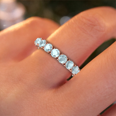 Das ist unser Vivienne 3.4-Ring. Dieser spezielle Typ wird als eternity Ring bezeichnet und ist mit einer durchgehenden Linie von identisch geschliffenen Edelsteinen besetzt. Er ist aus 14 Karat Roségold und mit kleineren 3.4 mm Aquamarins besetzt. Die erstaunlichen Aquamarins sind identisch in der Größe und im Ringband platziert. Unsere Aquamarins werden sorgfältig ausgewählt, damit sie identisch sind und somit das beste Ergebnis erzielen. Um das beste Ergebnis zu erzielen, positioniert unser Juwelier alle Aquamarins von Hand und mit größter Sorgfalt. Unsere Juweliere haben nur ein Ziel, nämlich den perfekten Ring zu kreieren. Deshalb lieben wir, was wir tun. Am Ende bekommen Sie einen atemberaubenden, klassische Roségold Vorsteckring mit einer Reihe von Aquamarins, die weder Anfang noch Ende zu haben scheinen. Das perfekte Symbol für Ihre unsterbliche Liebe zu ihr! Ist sie nicht eine Schönheit? Haben Sie ein bestimmtes Budget? Sie können uns gerne kontaktieren, damit wir Ihre Optionen besprechen können. Wir bieten unsere Ringe zum garantiert besten Preis, denn wir fertigen sie auf Bestellung. Solche Preise finden Sie nirgendwo anders!Unser Team von talentierten, leidenschaftlichen Designern fügt unserer Online-Kollektion täglich neue Ring-Designs hinzu. Unser Ziel dabei ist es, Ihnen eine große Vielfalt an Schmuckstücken anbieten zu können. Bitte zögern Sie nicht, ein Angebot anzufordern, wenn Sie spezielle Wünsche für Ihren Ring haben. Wir garantieren Ihnen ein Angebot, das Sie nicht ablehnen können.Um es einfacher zu machen, bieten wir eine kostenlose 30-tägige Rücksendung.