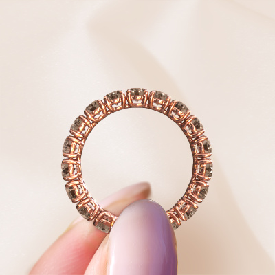 Das ist unser Vivienne 3.4-Ring. Dieser spezielle Typ wird als eternity Ring bezeichnet und ist mit einer durchgehenden Linie von identisch geschliffenen Edelsteinen besetzt. Er ist aus 14 Karat Roségold und mit kleineren 0.15 crt Braune Diamanten besetzt. Die erstaunlichen Braune Diamanten sind identisch in der Größe und im Ringband platziert. Unsere Braune Diamanten werden sorgfältig ausgewählt, damit sie identisch sind und somit das beste Ergebnis erzielen. Um das beste Ergebnis zu erzielen, positioniert unser Juwelier alle Braune Diamanten von Hand und mit größter Sorgfalt. Unsere Juweliere haben nur ein Ziel, nämlich den perfekten Ring zu kreieren. Deshalb lieben wir, was wir tun. Am Ende bekommen Sie einen atemberaubenden, klassische Roségold Vorsteckring mit einer Reihe von Braune Diamanten, die weder Anfang noch Ende zu haben scheinen. Das perfekte Symbol für Ihre unsterbliche Liebe zu ihr! Ist sie nicht eine Schönheit? Haben Sie ein bestimmtes Budget? Sie können uns gerne kontaktieren, damit wir Ihre Optionen besprechen können. Wir bieten unsere Ringe zum garantiert besten Preis, denn wir fertigen sie auf Bestellung. Solche Preise finden Sie nirgendwo anders!Unser Team von talentierten, leidenschaftlichen Designern fügt unserer Online-Kollektion täglich neue Ring-Designs hinzu. Unser Ziel dabei ist es, Ihnen eine große Vielfalt an Schmuckstücken anbieten zu können. Bitte zögern Sie nicht, ein Angebot anzufordern, wenn Sie spezielle Wünsche für Ihren Ring haben. Wir garantieren Ihnen ein Angebot, das Sie nicht ablehnen können.Um es einfacher zu machen, bieten wir eine kostenlose 30-tägige Rücksendung.