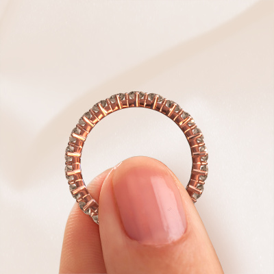 Das ist unser Janie 2.7mm-Ring. Dieser spezielle Typ wird als eternity Ring bezeichnet und ist mit einer durchgehenden Linie von identisch geschliffenen Edelsteinen besetzt. Er ist aus 14 Karat Roségold und mit kleineren 0.08 crt Braune Diamanten besetzt. Die erstaunlichen Braune Diamanten sind identisch in der Größe und im Ringband platziert. Unsere Braune Diamanten werden sorgfältig ausgewählt, damit sie identisch sind und somit das beste Ergebnis erzielen. Um das beste Ergebnis zu erzielen, positioniert unser Juwelier alle Braune Diamanten von Hand und mit größter Sorgfalt. Unsere Juweliere haben nur ein Ziel, nämlich den perfekten Ring zu kreieren. Deshalb lieben wir, was wir tun. Am Ende bekommen Sie einen atemberaubenden, trendige Roségold Vorsteckring mit einer Reihe von Braune Diamanten, die weder Anfang noch Ende zu haben scheinen. Das perfekte Symbol für Ihre unsterbliche Liebe zu ihr! Ist sie nicht eine Schönheit? Durch die Kombination modernster Technik mit uralter Handwerkskunst können wir alle Ringe in unserem eigenen Studio anfertigen. Jedes Schmuckstück wird auf Anfrage gefertigt. Das ist vorteilhaft, weil wir Ihnen dadurch einen Preis anbieten können, den Sie nirgendwo anders finden.