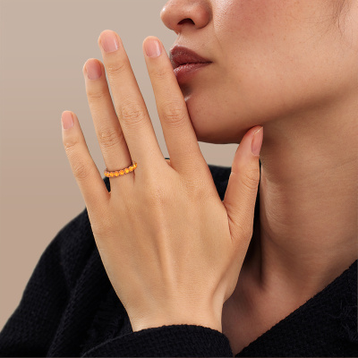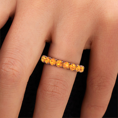 Das ist unser Estee 3.4-Ring. Dieser spezielle Typ wird als eternity Ring bezeichnet und ist mit einer durchgehenden Linie von identisch geschliffenen Edelsteinen besetzt. Er ist aus 14 Karat Roségold und mit kleineren 3.4 mm Citrin besetzt. Die erstaunlichen Citrin sind identisch in der Größe und im Ringband platziert. Unsere Citrin werden sorgfältig ausgewählt, damit sie identisch sind und somit das beste Ergebnis erzielen. Um das beste Ergebnis zu erzielen, positioniert unser Juwelier alle Citrin von Hand und mit größter Sorgfalt. Unsere Juweliere haben nur ein Ziel, nämlich den perfekten Ring zu kreieren. Deshalb lieben wir, was wir tun. Am Ende bekommen Sie einen atemberaubenden, moderne Roségold Vorsteckring mit einer Reihe von Citrin, die weder Anfang noch Ende zu haben scheinen. Das perfekte Symbol für Ihre unsterbliche Liebe zu ihr! Ist sie nicht eine Schönheit? Durch die Kombination modernster Technik mit uralter Handwerkskunst können wir alle Ringe in unserem eigenen Studio anfertigen. Jedes Schmuckstück wird auf Anfrage gefertigt. Das ist vorteilhaft, weil wir Ihnen dadurch einen Preis anbieten können, den Sie nirgendwo anders finden.
