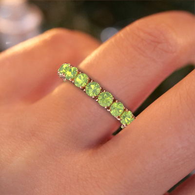 Das ist unser Vivienne 3.4-Ring. Dieser spezielle Typ wird als eternity Ring bezeichnet und ist mit einer durchgehenden Linie von identisch geschliffenen Edelsteinen besetzt. Er ist aus 14 Karat Roségold und mit kleineren 3.4 mm Peridot besetzt. Die erstaunlichen Peridot sind identisch in der Größe und im Ringband platziert. Unsere Peridot werden sorgfältig ausgewählt, damit sie identisch sind und somit das beste Ergebnis erzielen. Um das beste Ergebnis zu erzielen, positioniert unser Juwelier alle Peridot von Hand und mit größter Sorgfalt. Unsere Juweliere haben nur ein Ziel, nämlich den perfekten Ring zu kreieren. Deshalb lieben wir, was wir tun. Am Ende bekommen Sie einen atemberaubenden, klassische Roségold Vorsteckring mit einer Reihe von Peridot, die weder Anfang noch Ende zu haben scheinen. Das perfekte Symbol für Ihre unsterbliche Liebe zu ihr! Ist sie nicht eine Schönheit? Haben Sie ein bestimmtes Budget? Sie können uns gerne kontaktieren, damit wir Ihre Optionen besprechen können. Wir bieten unsere Ringe zum garantiert besten Preis, denn wir fertigen sie auf Bestellung. Solche Preise finden Sie nirgendwo anders!Unser Team von talentierten, leidenschaftlichen Designern fügt unserer Online-Kollektion täglich neue Ring-Designs hinzu. Unser Ziel dabei ist es, Ihnen eine große Vielfalt an Schmuckstücken anbieten zu können. Bitte zögern Sie nicht, ein Angebot anzufordern, wenn Sie spezielle Wünsche für Ihren Ring haben. Wir garantieren Ihnen ein Angebot, das Sie nicht ablehnen können.Um es einfacher zu machen, bieten wir eine kostenlose 30-tägige Rücksendung.