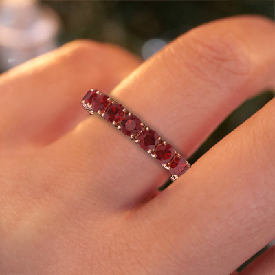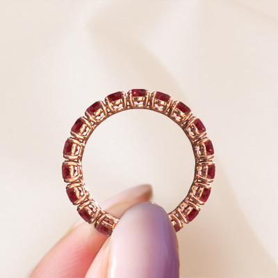 Das ist unser Vivienne 3.4-Ring. Dieser spezielle Typ wird als eternity Ring bezeichnet und ist mit einer durchgehenden Linie von identisch geschliffenen Edelsteinen besetzt. Er ist aus 14 Karat Roségold und mit kleineren 3.4 mm Rubin besetzt. Die erstaunlichen Rubin sind identisch in der Größe und im Ringband platziert. Unsere Rubin werden sorgfältig ausgewählt, damit sie identisch sind und somit das beste Ergebnis erzielen. Um das beste Ergebnis zu erzielen, positioniert unser Juwelier alle Rubin von Hand und mit größter Sorgfalt. Unsere Juweliere haben nur ein Ziel, nämlich den perfekten Ring zu kreieren. Deshalb lieben wir, was wir tun. Am Ende bekommen Sie einen atemberaubenden, klassische Roségold Vorsteckring mit einer Reihe von Rubin, die weder Anfang noch Ende zu haben scheinen. Das perfekte Symbol für Ihre unsterbliche Liebe zu ihr! Ist sie nicht eine Schönheit? Haben Sie ein bestimmtes Budget? Sie können uns gerne kontaktieren, damit wir Ihre Optionen besprechen können. Wir bieten unsere Ringe zum garantiert besten Preis, denn wir fertigen sie auf Bestellung. Solche Preise finden Sie nirgendwo anders!Unser Team von talentierten, leidenschaftlichen Designern fügt unserer Online-Kollektion täglich neue Ring-Designs hinzu. Unser Ziel dabei ist es, Ihnen eine große Vielfalt an Schmuckstücken anbieten zu können. Bitte zögern Sie nicht, ein Angebot anzufordern, wenn Sie spezielle Wünsche für Ihren Ring haben. Wir garantieren Ihnen ein Angebot, das Sie nicht ablehnen können.Um es einfacher zu machen, bieten wir eine kostenlose 30-tägige Rücksendung.