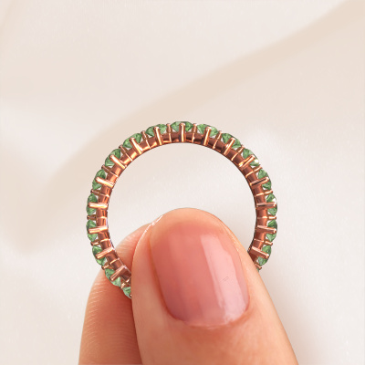Das ist unser Janie 2.7mm-Ring. Dieser spezielle Typ wird als eternity Ring bezeichnet und ist mit einer durchgehenden Linie von identisch geschliffenen Edelsteinen besetzt. Er ist aus 14 Karat Roségold und mit kleineren 2.7 mm grüner Turmalin besetzt. Die erstaunlichen grüner Turmalin sind identisch in der Größe und im Ringband platziert. Unsere grüner Turmalin werden sorgfältig ausgewählt, damit sie identisch sind und somit das beste Ergebnis erzielen. Um das beste Ergebnis zu erzielen, positioniert unser Juwelier alle grüner Turmalin von Hand und mit größter Sorgfalt. Unsere Juweliere haben nur ein Ziel, nämlich den perfekten Ring zu kreieren. Deshalb lieben wir, was wir tun. Am Ende bekommen Sie einen atemberaubenden, trendige Roségold Vorsteckring mit einer Reihe von grüner Turmalin, die weder Anfang noch Ende zu haben scheinen. Das perfekte Symbol für Ihre unsterbliche Liebe zu ihr! Ist sie nicht eine Schönheit? Durch die Kombination modernster Technik mit uralter Handwerkskunst können wir alle Ringe in unserem eigenen Studio anfertigen. Jedes Schmuckstück wird auf Anfrage gefertigt. Das ist vorteilhaft, weil wir Ihnen dadurch einen Preis anbieten können, den Sie nirgendwo anders finden.