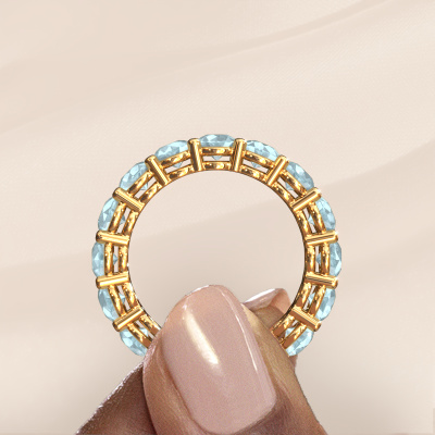 Das ist unser Michelle full 4.0-Ring. Dieser spezielle Typ wird als eternity Ring bezeichnet und ist mit einer durchgehenden Linie von identisch geschliffenen Edelsteinen besetzt. Er ist aus 14 Karat Gold und mit kleineren 4 mm Aquamarins besetzt. Die erstaunlichen Aquamarins sind identisch in der Größe und im Ringband platziert. Unsere Aquamarins werden sorgfältig ausgewählt, damit sie identisch sind und somit das beste Ergebnis erzielen. Um das beste Ergebnis zu erzielen, positioniert unser Juwelier alle Aquamarins von Hand und mit größter Sorgfalt. Unsere Juweliere haben nur ein Ziel, nämlich den perfekten Ring zu kreieren. Deshalb lieben wir, was wir tun. Am Ende bekommen Sie einen atemberaubenden, moderne Gold Vorsteckring mit einer Reihe von Aquamarins, die weder Anfang noch Ende zu haben scheinen. Das perfekte Symbol für Ihre unsterbliche Liebe zu ihr! Ist sie nicht eine Schönheit? Durch die Kombination modernster Technik mit uralter Handwerkskunst können wir alle Ringe in unserem eigenen Studio anfertigen. Jedes Schmuckstück wird auf Anfrage gefertigt. Das ist vorteilhaft, weil wir Ihnen dadurch einen Preis anbieten können, den Sie nirgendwo anders finden.Unsere talentierten, leidenschaftlichen Designer fügen unserer Online-Kollektion täglich neue Designs hinzu. Zusammen versuchen sie, eine vielfältige Kollektion feinster Schmuckstücke zu erstellen. Wenn Sie es vorziehen, einen Ring nach Ihrem eigenen Entwurf zu machen, können Sie gerne ein Angebot anfordern. Wir machen Ihnen ein großartiges Angebot, basierend auf Qualität und Preis.Um es einfacher zu machen, bieten wir eine kostenlose 30-tägige Rücksendung.