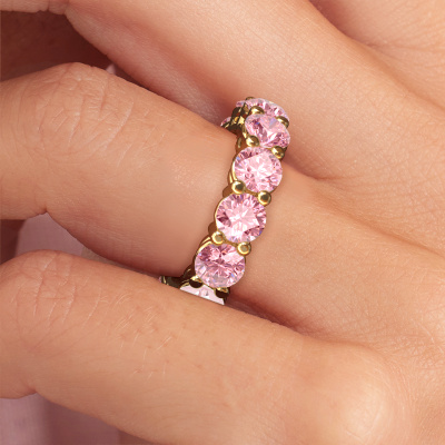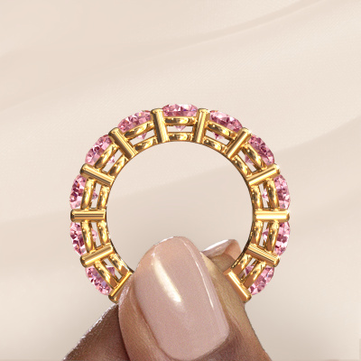 Das ist unser Michelle full 5.0-Ring. Dieser spezielle Typ wird als eternity Ring bezeichnet und ist mit einer durchgehenden Linie von identisch geschliffenen Edelsteinen besetzt. Er ist aus 14 Karat Gold und mit kleineren 5 mm rosa Labordiamanten besetzt. Die erstaunlichen rosa Labordiamanten sind identisch in der Größe und im Ringband platziert. Unsere rosa Labordiamanten werden sorgfältig ausgewählt, damit sie identisch sind und somit das beste Ergebnis erzielen. Um das beste Ergebnis zu erzielen, positioniert unser Juwelier alle rosa Labordiamanten von Hand und mit größter Sorgfalt. Unsere Juweliere haben nur ein Ziel, nämlich den perfekten Ring zu kreieren. Deshalb lieben wir, was wir tun. Am Ende bekommen Sie einen atemberaubenden, exklusive Gold Vorsteckring mit einer Reihe von rosa Labordiamanten, die weder Anfang noch Ende zu haben scheinen. Das perfekte Symbol für Ihre unsterbliche Liebe zu ihr! Ist sie nicht eine Schönheit? Durch die Kombination modernster Technik mit uralter Handwerkskunst können wir alle Ringe in unserem eigenen Studio anfertigen. Jedes Schmuckstück wird auf Anfrage gefertigt. Das ist vorteilhaft, weil wir Ihnen dadurch einen Preis anbieten können, den Sie nirgendwo anders finden.Unsere Online-Kollektion wird täglich um neue Schmuckdesigns ergänzt. Unser Team von leidenschaftlichen Designern ist bemüht, außergewöhnliche und vielfältige Designs zu kreieren. Haben Sie einen Ring gesehen, der Ihnen gefällt? Setzen Sie sich mit uns in Verbindung. Basierend auf einem guten Preis/Leistungsverhältnis machen wir Ihnen ein Angebot, das Sie nicht ablehnen können!Um es einfacher zu machen, bieten wir eine kostenlose 30-tägige Rücksendung.
