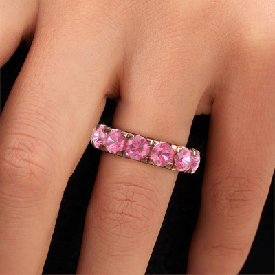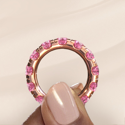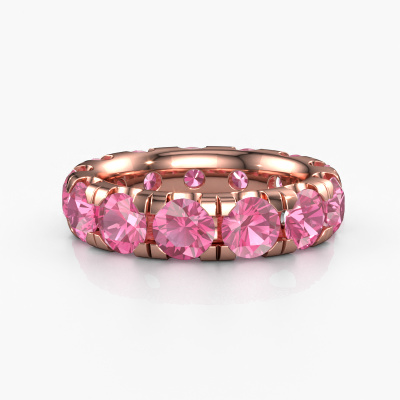 Das ist unser Jackie 5.0-Ring. Dieser spezielle Typ wird als eternity Ring bezeichnet und ist mit einer durchgehenden Linie von identisch geschliffenen Edelsteinen besetzt. Er ist aus 14 Karat Roségold und mit kleineren 5 mm Pink Saphir besetzt. Die erstaunlichen Pink Saphir sind identisch in der Größe und im Ringband platziert. Unsere Pink Saphir werden sorgfältig ausgewählt, damit sie identisch sind und somit das beste Ergebnis erzielen. Um das beste Ergebnis zu erzielen, positioniert unser Juwelier alle Pink Saphir von Hand und mit größter Sorgfalt. Unsere Juweliere haben nur ein Ziel, nämlich den perfekten Ring zu kreieren. Deshalb lieben wir, was wir tun. Am Ende bekommen Sie einen atemberaubenden, exklusive Roségold Vorsteckring mit einer Reihe von Pink Saphir, die weder Anfang noch Ende zu haben scheinen. Das perfekte Symbol für Ihre unsterbliche Liebe zu ihr! Ist sie nicht eine Schönheit? Nach Erhalt Ihrer Bestellung beginnen unsere Goldschmiede mit Leidenschaft den kreativen Prozess und fertigen Ihren Ring in unserem eigenen Studio. Da wir keine großen Lager haben, werden diese Kosten nicht an Sie weitergegeben. Unsere Preisgestaltung ist der Beweis dafür! Wir bieten Schmuck zum niedrigsten Preis, garantiert.Unsere talentierten, leidenschaftlichen Designer fügen unserer Online-Kollektion täglich neue Designs hinzu. Zusammen versuchen sie, eine vielfältige Kollektion feinster Schmuckstücke zu erstellen. Wenn Sie es vorziehen, einen Ring nach Ihrem eigenen Entwurf zu machen, können Sie gerne ein Angebot anfordern. Wir machen Ihnen ein großartiges Angebot, basierend auf Qualität und Preis.Um es einfacher zu machen, bieten wir eine kostenlose 30-tägige Rücksendung.
