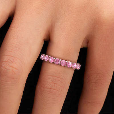 Das ist unser Jackie 3.0-Ring. Dieser spezielle Typ wird als eternity Ring bezeichnet und ist mit einer durchgehenden Linie von identisch geschliffenen Edelsteinen besetzt. Er ist aus 14 Karat Roségold und mit kleineren 3 mm Pink Saphir besetzt. Die erstaunlichen Pink Saphir sind identisch in der Größe und im Ringband platziert. Unsere Pink Saphir werden sorgfältig ausgewählt, damit sie identisch sind und somit das beste Ergebnis erzielen. Um das beste Ergebnis zu erzielen, positioniert unser Juwelier alle Pink Saphir von Hand und mit größter Sorgfalt. Unsere Juweliere haben nur ein Ziel, nämlich den perfekten Ring zu kreieren. Deshalb lieben wir, was wir tun. Am Ende bekommen Sie einen atemberaubenden, moderne Roségold Vorsteckring mit einer Reihe von Pink Saphir, die weder Anfang noch Ende zu haben scheinen. Das perfekte Symbol für Ihre unsterbliche Liebe zu ihr! Ist sie nicht eine Schönheit? Durch die Kombination modernster Technik mit uralter Handwerkskunst können wir alle Ringe in unserem eigenen Studio anfertigen. Jedes Schmuckstück wird auf Anfrage gefertigt. Das ist vorteilhaft, weil wir Ihnen dadurch einen Preis anbieten können, den Sie nirgendwo anders finden.