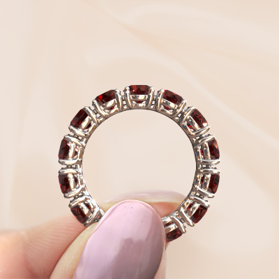 Das ist unser Vivienne 4.7-Ring. Dieser spezielle Typ wird als eternity Ring bezeichnet und ist mit einer durchgehenden Linie von identisch geschliffenen Edelsteinen besetzt. Er ist aus 14 Karat Weißgold und mit kleineren 4.7 mm Granat besetzt. Die erstaunlichen Granat sind identisch in der Größe und im Ringband platziert. Unsere Granat werden sorgfältig ausgewählt, damit sie identisch sind und somit das beste Ergebnis erzielen. Um das beste Ergebnis zu erzielen, positioniert unser Juwelier alle Granat von Hand und mit größter Sorgfalt. Unsere Juweliere haben nur ein Ziel, nämlich den perfekten Ring zu kreieren. Deshalb lieben wir, was wir tun. Am Ende bekommen Sie einen atemberaubenden, exklusive Weißgold Ring mit einer Reihe von Granat, die weder Anfang noch Ende zu haben scheinen. Das perfekte Symbol für Ihre unsterbliche Liebe zu ihr! Ist sie nicht eine Schönheit? Nach Erhalt Ihrer Bestellung beginnen unsere Goldschmiede mit Leidenschaft den kreativen Prozess und fertigen Ihren Ring in unserem eigenen Studio. Da wir keine großen Lager haben, werden diese Kosten nicht an Sie weitergegeben. Unsere Preisgestaltung ist der Beweis dafür! Wir bieten Schmuck zum niedrigsten Preis, garantiert.Unsere talentierten, leidenschaftlichen Designer fügen unserer Online-Kollektion täglich neue Designs hinzu. Zusammen versuchen sie, eine vielfältige Kollektion feinster Schmuckstücke zu erstellen. Wenn Sie es vorziehen, einen Ring nach Ihrem eigenen Entwurf zu machen, können Sie gerne ein Angebot anfordern. Wir machen Ihnen ein großartiges Angebot, basierend auf Qualität und Preis.Um es einfacher zu machen, bieten wir eine kostenlose 30-tägige Rücksendung.