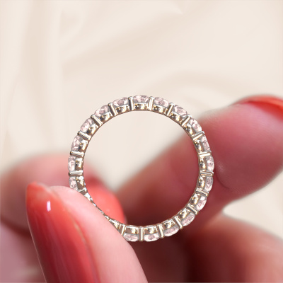 Das ist unser Heddy rnd 2.9-Ring. Dieser spezielle Typ wird als eternity Ring bezeichnet und ist mit einer durchgehenden Linie von identisch geschliffenen Edelsteinen besetzt. Er ist aus 14 Karat Weißgold und mit kleineren 2.9 mm Morganit Champagner besetzt. Die erstaunlichen Morganit Champagner sind identisch in der Größe und im Ringband platziert. Unsere Morganit Champagner werden sorgfältig ausgewählt, damit sie identisch sind und somit das beste Ergebnis erzielen. Um das beste Ergebnis zu erzielen, positioniert unser Juwelier alle Morganit Champagner von Hand und mit größter Sorgfalt. Unsere Juweliere haben nur ein Ziel, nämlich den perfekten Ring zu kreieren. Deshalb lieben wir, was wir tun. Am Ende bekommen Sie einen atemberaubenden, klassische Weißgold Ring mit einer Reihe von Morganit Champagner, die weder Anfang noch Ende zu haben scheinen. Das perfekte Symbol für Ihre unsterbliche Liebe zu ihr! Ist sie nicht eine Schönheit?
