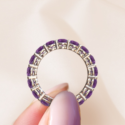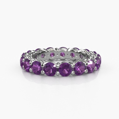 Das ist unser Michelle full 3.7-Ring. Dieser spezielle Typ wird als eternity Ring bezeichnet und ist mit einer durchgehenden Linie von identisch geschliffenen Edelsteinen besetzt. Er ist aus 14 Karat Weißgold und mit kleineren 3.7 mm Amethysten besetzt. Die erstaunlichen Amethysten sind identisch in der Größe und im Ringband platziert. Unsere Amethysten werden sorgfältig ausgewählt, damit sie identisch sind und somit das beste Ergebnis erzielen. Um das beste Ergebnis zu erzielen, positioniert unser Juwelier alle Amethysten von Hand und mit größter Sorgfalt. Unsere Juweliere haben nur ein Ziel, nämlich den perfekten Ring zu kreieren. Deshalb lieben wir, was wir tun. Am Ende bekommen Sie einen atemberaubenden, moderne Weißgold Vorsteckring mit einer Reihe von Amethysten, die weder Anfang noch Ende zu haben scheinen. Das perfekte Symbol für Ihre unsterbliche Liebe zu ihr! Ist sie nicht eine Schönheit? Da wir unsere eigenen Ringe entwerfen und liefern, können wir Ihnen einen Ring zu einem Preis anbieten, den Sie nirgendwo anders finden. Ein Ring wird auf Bestellung angefertigt, wodurch kein überschüssiges Material anfällt. So können wir Ihnen ein gutes Angebot zum besten Preis machen. Wir verstehen, dass es sich riskant anfühlt, Ihren Ring online zu kaufen. Jedoch helfen wir Ihnen gerne beim Designprozess unter Berücksichtigung Ihres Budgets.Unser Team von talentierten, leidenschaftlichen Designern fügt unserer Online-Kollektion täglich neue Ringe-Designs hinzu. Unser Ziel dabei ist es, Ihnen eine große Vielfalt an Schmuckstücken anbieten zu können. Bitte zögern Sie nicht, ein Angebot anzufordern, wenn Sie spezielle Wünsche für Ihren Ring haben. Wir garantieren Ihnen ein Angebot, das Sie nicht ablehnen können.Um es einfacher zu machen, bieten wir eine kostenlose 30-tägige Rücksendung.