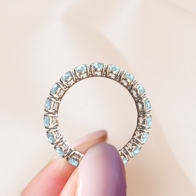 Das ist unser Vivienne 3.4-Ring. Dieser spezielle Typ wird als eternity Ring bezeichnet und ist mit einer durchgehenden Linie von identisch geschliffenen Edelsteinen besetzt. Er ist aus 14 Karat Weißgold und mit kleineren 3.4 mm Aquamarins besetzt. Die erstaunlichen Aquamarins sind identisch in der Größe und im Ringband platziert. Unsere Aquamarins werden sorgfältig ausgewählt, damit sie identisch sind und somit das beste Ergebnis erzielen. Um das beste Ergebnis zu erzielen, positioniert unser Juwelier alle Aquamarins von Hand und mit größter Sorgfalt. Unsere Juweliere haben nur ein Ziel, nämlich den perfekten Ring zu kreieren. Deshalb lieben wir, was wir tun. Am Ende bekommen Sie einen atemberaubenden, klassische Weißgold Vorsteckring mit einer Reihe von Aquamarins, die weder Anfang noch Ende zu haben scheinen. Das perfekte Symbol für Ihre unsterbliche Liebe zu ihr! Ist sie nicht eine Schönheit? Haben Sie ein bestimmtes Budget? Sie können uns gerne kontaktieren, damit wir Ihre Optionen besprechen können. Wir bieten unsere Ringe zum garantiert besten Preis, denn wir fertigen sie auf Bestellung. Solche Preise finden Sie nirgendwo anders!Unser Team von talentierten, leidenschaftlichen Designern fügt unserer Online-Kollektion täglich neue Ring-Designs hinzu. Unser Ziel dabei ist es, Ihnen eine große Vielfalt an Schmuckstücken anbieten zu können. Bitte zögern Sie nicht, ein Angebot anzufordern, wenn Sie spezielle Wünsche für Ihren Ring haben. Wir garantieren Ihnen ein Angebot, das Sie nicht ablehnen können.Um es einfacher zu machen, bieten wir eine kostenlose 30-tägige Rücksendung.