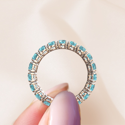 Das ist unser Vivienne 3.4-Ring. Dieser spezielle Typ wird als eternity Ring bezeichnet und ist mit einer durchgehenden Linie von identisch geschliffenen Edelsteinen besetzt. Er ist aus 14 Karat Weißgold und mit kleineren 3.4 mm Blaue Topas besetzt. Die erstaunlichen Blaue Topas sind identisch in der Größe und im Ringband platziert. Unsere Blaue Topas werden sorgfältig ausgewählt, damit sie identisch sind und somit das beste Ergebnis erzielen. Um das beste Ergebnis zu erzielen, positioniert unser Juwelier alle Blaue Topas von Hand und mit größter Sorgfalt. Unsere Juweliere haben nur ein Ziel, nämlich den perfekten Ring zu kreieren. Deshalb lieben wir, was wir tun. Am Ende bekommen Sie einen atemberaubenden, klassische Weißgold Vorsteckring mit einer Reihe von Blaue Topas, die weder Anfang noch Ende zu haben scheinen. Das perfekte Symbol für Ihre unsterbliche Liebe zu ihr! Ist sie nicht eine Schönheit? Haben Sie ein bestimmtes Budget? Sie können uns gerne kontaktieren, damit wir Ihre Optionen besprechen können. Wir bieten unsere Ringe zum garantiert besten Preis, denn wir fertigen sie auf Bestellung. Solche Preise finden Sie nirgendwo anders!Unser Team von talentierten, leidenschaftlichen Designern fügt unserer Online-Kollektion täglich neue Ring-Designs hinzu. Unser Ziel dabei ist es, Ihnen eine große Vielfalt an Schmuckstücken anbieten zu können. Bitte zögern Sie nicht, ein Angebot anzufordern, wenn Sie spezielle Wünsche für Ihren Ring haben. Wir garantieren Ihnen ein Angebot, das Sie nicht ablehnen können.Um es einfacher zu machen, bieten wir eine kostenlose 30-tägige Rücksendung.