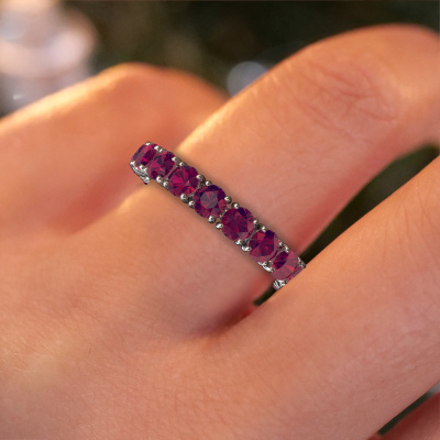 Das ist unser Vivienne 3.4-Ring. Dieser spezielle Typ wird als eternity Ring bezeichnet und ist mit einer durchgehenden Linie von identisch geschliffenen Edelsteinen besetzt. Er ist aus 14 Karat Weißgold und mit kleineren 3.4 mm Rhodolit besetzt. Die erstaunlichen Rhodolit sind identisch in der Größe und im Ringband platziert. Unsere Rhodolit werden sorgfältig ausgewählt, damit sie identisch sind und somit das beste Ergebnis erzielen. Um das beste Ergebnis zu erzielen, positioniert unser Juwelier alle Rhodolit von Hand und mit größter Sorgfalt. Unsere Juweliere haben nur ein Ziel, nämlich den perfekten Ring zu kreieren. Deshalb lieben wir, was wir tun. Am Ende bekommen Sie einen atemberaubenden, klassische Weißgold Vorsteckring mit einer Reihe von Rhodolit, die weder Anfang noch Ende zu haben scheinen. Das perfekte Symbol für Ihre unsterbliche Liebe zu ihr! Ist sie nicht eine Schönheit? Haben Sie ein bestimmtes Budget? Sie können uns gerne kontaktieren, damit wir Ihre Optionen besprechen können. Wir bieten unsere Ringe zum garantiert besten Preis, denn wir fertigen sie auf Bestellung. Solche Preise finden Sie nirgendwo anders!Unser Team von talentierten, leidenschaftlichen Designern fügt unserer Online-Kollektion täglich neue Ring-Designs hinzu. Unser Ziel dabei ist es, Ihnen eine große Vielfalt an Schmuckstücken anbieten zu können. Bitte zögern Sie nicht, ein Angebot anzufordern, wenn Sie spezielle Wünsche für Ihren Ring haben. Wir garantieren Ihnen ein Angebot, das Sie nicht ablehnen können.Um es einfacher zu machen, bieten wir eine kostenlose 30-tägige Rücksendung.