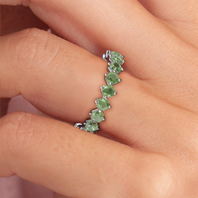 Das ist unser Janie 3.0mm-Ring. Dieser spezielle Typ wird als eternity Ring bezeichnet und ist mit einer durchgehenden Linie von identisch geschliffenen Edelsteinen besetzt. Er ist aus 14 Karat Weißgold und mit kleineren 3 mm grüner Turmalin besetzt. Die erstaunlichen grüner Turmalin sind identisch in der Größe und im Ringband platziert. Unsere grüner Turmalin werden sorgfältig ausgewählt, damit sie identisch sind und somit das beste Ergebnis erzielen. Um das beste Ergebnis zu erzielen, positioniert unser Juwelier alle grüner Turmalin von Hand und mit größter Sorgfalt. Unsere Juweliere haben nur ein Ziel, nämlich den perfekten Ring zu kreieren. Deshalb lieben wir, was wir tun. Am Ende bekommen Sie einen atemberaubenden, Fantasie Weißgold Vorsteckring mit einer Reihe von grüner Turmalin, die weder Anfang noch Ende zu haben scheinen. Das perfekte Symbol für Ihre unsterbliche Liebe zu ihr! Ist sie nicht eine Schönheit? Durch die Kombination modernster Technik mit uralter Handwerkskunst können wir alle Ringe in unserem eigenen Studio anfertigen. Jedes Schmuckstück wird auf Anfrage gefertigt. Das ist vorteilhaft, weil wir Ihnen dadurch einen Preis anbieten können, den Sie nirgendwo anders finden.