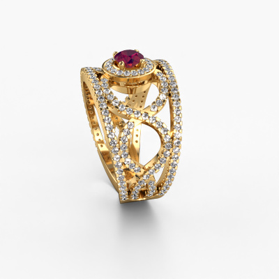 Dieser exklusive Gold Regina Ring ist ein wahres Kunstwerk! Dieser Ring besteht aus 14 Karat Gold und ist mit 4.2 mm rund Rhodolit besetzt. Die kleinsten Ornamente werden mit viel Geduld und großer Leidenschaft von unserem Goldschiede gefertigt. Um diesen Ring mit großer Präzision zu schaffen, erfordert dieses Handwerk ein scharfes Auge und eine geschickte Hand. Eine Herausforderung, die bei unseren erfahrenen Goldschmieden eine Leidenschaft entfacht. Die exquisiten Rhodolit sind so gesetzt, dass ihre einzigartigen Qualitäten verstärkt werden. Dies verleiht dem Ring eine noch glamouröse Erscheinung. Der Ring ist für sich einzigartig, wegen der natürlichen Edelsteine, die wir speziell für diesen Regina Ring ausgewählt haben. Und indem Sie das Edelmetall selbst auswählen, kreieren Sie einen einzigartigen Ring. Wie gefällt Ihnen dieser exklusive Gold Ring? Passen Sie diesen Regina Ring einfach mit unserem Online-Tool an. Anschließend wird Ihr persönlicher, besondere Regina Ring in Handarbeit von unseren Goldschmieden angefertigt. Edelmetalle und Edelsteine können nach Ihren Wünschen angepasst werden. Haben Sie spezielle Wünsche, die in unserem Online-Tool nicht verfügbar sind? Setzen Sie sich mit uns in Verbindung. Wir passen Ihren persönlichen exklusive Ring nach Ihren Wünschen an.Mit unserer modernen Technik können wir Schmuckstücke von höchster Qualität mit größter Sorgfalt für Sie entwerfen und anpassen. Unsere Ringe sind immer um 30 Prozent günstiger als bei anderen Juwelieren. Wir fertigen Ringe auf Bestellung, also müssen wir keine großen Lager unterhalten. Wenn Sie ein bestimmtes Budget haben, beraten wir Sie gerne entsprechend.Um es einfacher zu machen, bieten wir eine kostenlose 30-tägige Rücksendung.