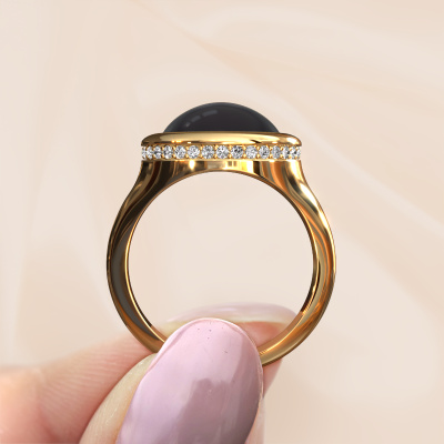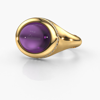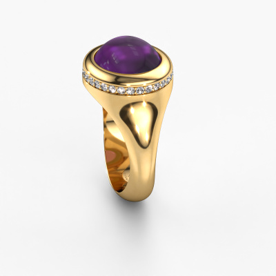 In diesem Foto ist der Gold Lesli OVL Ring mit einem 12x10 mm oval cabochon Amethyst besetzt. Cabochon bedeutet, dass ein Amethyst zuerst geformt, nicht facettiert wird. Nämlich in eine bestimmte Form wie einen Tropfen, ein Herz oder ein oval cabochon. Anschließend wird er poliert, bis der Edelstein eine Runde Oberfläche hat. Ein Cabochon-Edelstein ist ein atemberaubender, nobler Blickfang, der perfekt zu einem zeitgenössischen wie auch zu einem Vintage-Stil passt. Unsere erfahrenen Goldschmiede formen den modische Ring bis zur Perfektion und machen ihn einzigartig. Der Cabochon Amethyst ist so gefasst, dass seine einzigartigen Qualitäten verstärkt werden. Wie gefällt Ihnen dieser moderne Gold Ring? Passen Sie diesen Lesli OVL Ring einfach mit unserem Online-Tool an. Anschließend wird Ihr persönlicher, modische Lesli OVL Ring in Handarbeit von unseren Goldschmieden angefertigt. Edelmetalle und Edelsteine können nach Ihren Wünschen angepasst werden. Haben Sie spezielle Wünsche, die in unserem Online-Tool nicht verfügbar sind? Setzen Sie sich mit uns in Verbindung. Wir passen Ihren persönlichen moderne Ring nach Ihren Wünschen an.Durch die Kombination modernster Technik mit uralter Handwerkskunst können wir alle Ringe in unserem eigenen Studio anfertigen. Jedes Schmuckstück wird auf Anfrage gefertigt. Das ist vorteilhaft, weil wir Ihnen dadurch einen Preis anbieten können, den Sie nirgendwo anders finden.Um es einfacher zu machen, bieten wir eine kostenlose 30-tägige Rücksendung.