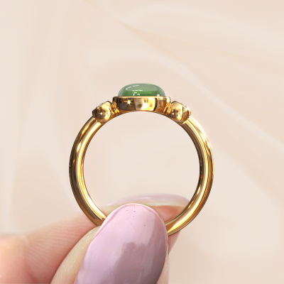 In diesem Foto ist der Gold Liane Ring mit einem 7x5 mm oval cabochon Turmalin grün besetzt. Cabochon bedeutet, dass ein Turmalin grün zuerst geformt, nicht facettiert wird. Nämlich in eine bestimmte Form wie einen Tropfen, ein Herz oder ein oval cabochon. Anschließend wird er poliert, bis der Edelstein eine Runde Oberfläche hat. Ein Cabochon-Edelstein ist ein atemberaubender, nobler Blickfang, der perfekt zu einem zeitgenössischen wie auch zu einem Vintage-Stil passt. Unsere erfahrenen Goldschmiede formen den zierliche Ring bis zur Perfektion und machen ihn einzigartig. Der Cabochon Turmalin grün ist so gefasst, dass seine einzigartigen Qualitäten verstärkt werden. Unsere Goldschmiede kreieren Ihren individuellen Ring leidenschaftlich, mit größter Sorgfalt und nach Ihren Wünschen. Das Gold Ring, wie hier abgebildet, kann mit unserem Online-Tool individuell angepasst werden. Bitte fragen Sie unsere Schmuckdesigner um Hilfe, wenn Sie Änderungen wünsche, die in unserem Online-Tool nicht verfügbar sind. Gerne beantworten wir Ihnen alle offenen Fragen.Durch die Kombination modernster Technik mit uralter Handwerkskunst können wir alle Ringe in unserem eigenen Studio anfertigen. Jedes Schmuckstück wird auf Anfrage gefertigt. Das ist vorteilhaft, weil wir Ihnen dadurch einen Preis anbieten können, den Sie nirgendwo anders finden.Um es einfacher zu machen, bieten wir eine kostenlose 30-tägige Rücksendung.