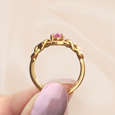 Dieser symbolische, Gold Zoe Ring wird mit Pink Saphir besetzt. Für einige ist ein Ring nicht mehr als ein schönes Modeartikel, aber sie können auch ein bedeutungsvolles Andenken werden. Ein solcher Ring kann täglich getragen werden und passt zu vielen verschiedenen Stilen. Entwerfen Sie Ihren eigenen einzigartigen Ring, machen Sie ihn noch spezieller. Sie werden jedes Mal an seine Einzigartigkeit erinnert, wenn Sie ihn ansehen. Vielleicht erinnert er Sie an jemand besonderen. Er könnte Erinnerungen wecken. Unvergessliche Momente, festgehalten in einem Ring. Das Schöne daran ist, dass die verwendeten Edelmetalle und Edelsteine ein Leben lang halten. Ein Leben voller Erinnerungen verdient nichts weniger!Sobald Sie Ihren Zoe Ring mit unserem Online-Tool fertiggestellt haben, beginnen unsere Goldschmiede mit der kreativen Anfertigung Ihres Ringes. Dieser wird mit Leidenschaft und Sorgfalt nach alter Handwerkskunst gefertigt. Darüber arbeiten wir mit ehrlichen Edelsteinen. Einfach online mit unserem Online-Tool anpassen, wenn Sie Änderungen wünschen. Wenn Sie spezielle Änderungen an Ihrem Zoe Gold Ring vornehmen möchten, die in unserem Online-Tool nicht verfügbar sind, wenden Sie sich bitte an unsere Experten.Mit unserer modernen Technik können wir Schmuckstücke von höchster Qualität mit größter Sorgfalt für Sie entwerfen und anpassen. Unsere Ringe sind immer um 30 Prozent günstiger als bei anderen Juwelieren. Wir fertigen Ringe auf Bestellung, also müssen wir keine großen Lager unterhalten. Wenn Sie ein bestimmtes Budget haben, beraten wir Sie gerne entsprechend.Um es einfacher zu machen, bieten wir eine kostenlose 30-tägige Rücksendung.