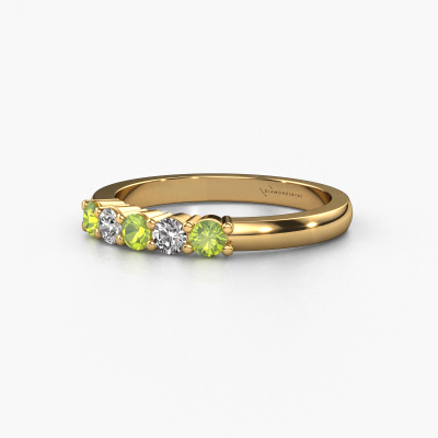 Dieser 5 Stone Ring wird Yasmin 5 genannt. Diese Art von Ring wird als Memoire ring bezeichnet, da seine Edelsteine in einer durchgehenden Linie angeordnet sind. Dadurch kann er einfach mit anderen Ringen kombiniert werden. Das Band dieses 14 Karat Gold Ring ist in einer Kombination aus Peridot und Diamant besetzt. Sie können ganz einfach online die Kombination auswählen, die Sie bevorzugen. Wie Sie sehen, wird bei diesem Gold Memoire Ring mehre Peridot gesetzt. Der Memoire ring steht für Zusammenwirken. Und genau das tun diese Edelsteine, zusammenwirken. Zusammen geben sie dem Band eines klassische Ring einen schönen Effekt! So ein bedeutungsvoller Ring, finden Sie nicht auch? Alle von uns ausgesuchten Peridot werden von unserem erfahrenen Goldschiede in Handarbeit eingefasst. Das ist eine präzise Aufgabe, die nur durch die Kombination von purer Handwerkskunst und dem Einsatz neuester Techniken erfolgreich durchgeführt werden kann, um eine optimale Wirkung zu erzielen. Um eine perfekte Lichtreflexion zu erzeugen, müssen alle Edelsteine auf die gleiche Weise perfekt ausgerichtet sein. Während der Fertigung wird der Goldschmied Meister daher ständig die Lichtreflexion überwachen, um zu gewährleisten, dass die Peridot perfekt ausgerichtet sind. Das erfordert eine geschickte Hand und viel Geduld, aber dann wird das Endprodukt zu einem echten Kunstwerk. Und genau das ist unsere Mission!Nach Erhalt Ihrer Bestellung beginnen unsere Goldschmiede mit Leidenschaft den kreativen Prozess und fertigen Ihren Ring in unserem eigenen Studio. Da wir keine großen Lager haben, werden diese Kosten nicht an Sie weitergegeben. Unsere Preisgestaltung ist der Beweis dafür! Wir bieten Schmuck zum niedrigsten Preis, garantiert.Unsere talentierten, leidenschaftlichen Designer fügen unserer Online-Kollektion täglich neue Designs hinzu. Zusammen versuchen sie, eine vielfältige Kollektion feinster Schmuckstücke zu erstellen. Wenn Sie es vorziehen, einen Ring nach Ihrem eigenen Entwurf zu machen, können Sie gerne ein Angebot anfordern. Wir machen Ihnen ein großartiges Angebot, basierend auf Qualität und Preis.Um es einfacher zu machen, bieten wir eine kostenlose 30-tägige Rücksendung.