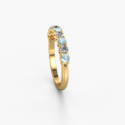 Dieser 9 Stone Ring wird Michelle 9 genannt. Diese Art von Ring wird als Memoire ring bezeichnet, da seine Edelsteine in einer durchgehenden Linie angeordnet sind. Dadurch kann er einfach mit anderen Ringen kombiniert werden. Das Band dieses 14 Karat Gold Ring ist in einer Kombination aus Aquamarin und Lab-grown Diamant besetzt. Sie können ganz einfach online die Kombination auswählen, die Sie bevorzugen. Wie Sie sehen, wird bei diesem Gold Memoire Ring mehre Aquamarins gesetzt. Der Memoire ring steht für Zusammenwirken. Und genau das tun diese Edelsteine, zusammenwirken. Zusammen geben sie dem Band eines klassische Ring einen schönen Effekt! So ein bedeutungsvoller Ring, finden Sie nicht auch? Alle von uns ausgesuchten Aquamarins werden von unserem erfahrenen Goldschiede in Handarbeit eingefasst. Das ist eine präzise Aufgabe, die nur durch die Kombination von purer Handwerkskunst und dem Einsatz neuester Techniken erfolgreich durchgeführt werden kann, um eine optimale Wirkung zu erzielen. Um eine perfekte Lichtreflexion zu erzeugen, müssen alle Edelsteine auf die gleiche Weise perfekt ausgerichtet sein. Während der Fertigung wird der Goldschmied Meister daher ständig die Lichtreflexion überwachen, um zu gewährleisten, dass die Aquamarins perfekt ausgerichtet sind. Das erfordert eine geschickte Hand und viel Geduld, aber dann wird das Endprodukt zu einem echten Kunstwerk. Und genau das ist unsere Mission!Da wir unsere eigenen Ringe entwerfen und liefern, können wir Ihnen einen Ring zu einem Preis anbieten, den Sie nirgendwo anders finden. Ein Ring wird auf Bestellung angefertigt, wodurch kein überschüssiges Material anfällt. So können wir Ihnen ein gutes Angebot zum besten Preis machen. Wir verstehen, dass es sich riskant anfühlt, Ihren Ring online zu kaufen. Jedoch helfen wir Ihnen gerne beim Designprozess unter Berücksichtigung Ihres Budgets.Unser Team von talentierten, leidenschaftlichen Designern fügt unserer Online-Kollektion täglich neue Ringe-Designs hinzu. Unser Ziel dabei ist es, Ihnen eine große Vielfalt an Schmuckstücken anbieten zu können. Bitte zögern Sie nicht, ein Angebot anzufordern, wenn Sie spezielle Wünsche für Ihren Ring haben. Wir garantieren Ihnen ein Angebot, das Sie nicht ablehnen können.Um es einfacher zu machen, bieten wir eine kostenlose 30-tägige Rücksendung.