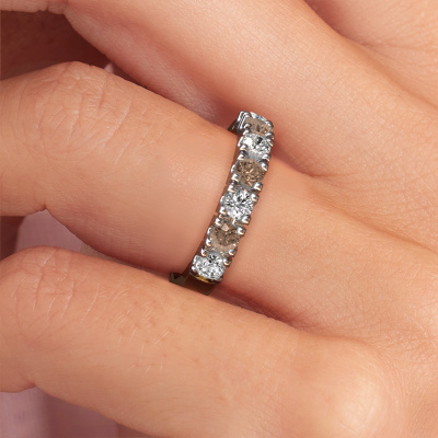 Dieser 7 Stone Ring wird Rianne 7 genannt. Diese Art von Ring wird als Memoire ring bezeichnet, da seine Edelsteine in einer durchgehenden Linie angeordnet sind. Dadurch kann er einfach mit anderen Ringen kombiniert werden. Das Band dieses 14 Karat Gold Ring ist in einer Kombination aus Braun Diamant und Lab-grown Diamant besetzt. Sie können ganz einfach online die Kombination auswählen, die Sie bevorzugen. Wie Sie sehen, wird bei diesem Gold Memoire Ring mehre Braune Diamanten gesetzt. Der Memoire ring steht für Zusammenwirken. Und genau das tun diese Edelsteine, zusammenwirken. Zusammen geben sie dem Band eines traditionell Ring einen schönen Effekt! So ein bedeutungsvoller Ring, finden Sie nicht auch? Alle von uns ausgesuchten Braune Diamanten werden von unserem erfahrenen Goldschiede in Handarbeit eingefasst. Das ist eine präzise Aufgabe, die nur durch die Kombination von purer Handwerkskunst und dem Einsatz neuester Techniken erfolgreich durchgeführt werden kann, um eine optimale Wirkung zu erzielen. Um eine perfekte Lichtreflexion zu erzeugen, müssen alle Edelsteine auf die gleiche Weise perfekt ausgerichtet sein. Während der Fertigung wird der Goldschmied Meister daher ständig die Lichtreflexion überwachen, um zu gewährleisten, dass die Braune Diamanten perfekt ausgerichtet sind. Das erfordert eine geschickte Hand und viel Geduld, aber dann wird das Endprodukt zu einem echten Kunstwerk. Und genau das ist unsere Mission!Da wir unsere eigenen Ringe entwerfen und liefern, können wir Ihnen einen Ring zu einem Preis anbieten, den Sie nirgendwo anders finden. Ein Ring wird auf Bestellung angefertigt, wodurch kein überschüssiges Material anfällt. So können wir Ihnen ein gutes Angebot zum besten Preis machen. Wir verstehen, dass es sich riskant anfühlt, Ihren Ring online zu kaufen. Jedoch helfen wir Ihnen gerne beim Designprozess unter Berücksichtigung Ihres Budgets.