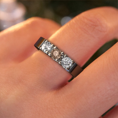Dieser 3 Stone Ring wird Dana 3 genannt. Diese Art von Ring wird als Memoire ring bezeichnet, da seine Edelsteine in einer durchgehenden Linie angeordnet sind. Dadurch kann er einfach mit anderen Ringen kombiniert werden. Das Band dieses Platin Ring ist in einer Kombination aus Braun Diamant und Lab-grown Diamant besetzt. Sie können ganz einfach online die Kombination auswählen, die Sie bevorzugen. Wie Sie sehen, wird bei diesem Platin Memoire Ring mehre Braune Diamanten gesetzt. Der Memoire ring steht für Zusammenwirken. Und genau das tun diese Edelsteine, zusammenwirken. Zusammen geben sie dem Band eines moderne Ring einen schönen Effekt! So ein bedeutungsvoller Ring, finden Sie nicht auch? Alle von uns ausgesuchten Braune Diamanten werden von unserem erfahrenen Goldschiede in Handarbeit eingefasst. Das ist eine präzise Aufgabe, die nur durch die Kombination von purer Handwerkskunst und dem Einsatz neuester Techniken erfolgreich durchgeführt werden kann, um eine optimale Wirkung zu erzielen. Um eine perfekte Lichtreflexion zu erzeugen, müssen alle Edelsteine auf die gleiche Weise perfekt ausgerichtet sein. Während der Fertigung wird der Goldschmied Meister daher ständig die Lichtreflexion überwachen, um zu gewährleisten, dass die Braune Diamanten perfekt ausgerichtet sind. Das erfordert eine geschickte Hand und viel Geduld, aber dann wird das Endprodukt zu einem echten Kunstwerk. Und genau das ist unsere Mission!Nach Erhalt Ihrer Bestellung beginnen unsere Goldschmiede mit Leidenschaft den kreativen Prozess und fertigen Ihren Ring in unserem eigenen Studio. Da wir keine großen Lager haben, werden diese Kosten nicht an Sie weitergegeben. Unsere Preisgestaltung ist der Beweis dafür! Wir bieten Schmuck zum niedrigsten Preis, garantiert.Unsere talentierten, leidenschaftlichen Designer fügen unserer Online-Kollektion täglich neue Designs hinzu. Zusammen versuchen sie, eine vielfältige Kollektion feinster Schmuckstücke zu erstellen. Wenn Sie es vorziehen, einen Ring nach Ihrem eigenen Entwurf zu machen, können Sie gerne ein Angebot anfordern. Wir machen Ihnen ein großartiges Angebot, basierend auf Qualität und Preis.Um es einfacher zu machen, bieten wir eine kostenlose 30-tägige Rücksendung.