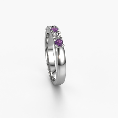 Dieser Memoire Ring wird Rianne 5 genannt. Diese Art von Ring wird als Memoire ring bezeichnet, da seine Edelsteine in einer durchgehenden Linie angeordnet sind. Dadurch kann er einfach mit anderen Ringen kombiniert werden. Das Band dieses 14 Karat Weißgold Ring ist in einer Kombination aus Amethyst und Diamant besetzt. Sie können ganz einfach online die Kombination auswählen, die Sie bevorzugen. Wie Sie sehen, wird bei diesem Weißgold Memoire Ring mehre Amethysten gesetzt. Der Memoire ring steht für Zusammenwirken. Und genau das tun diese Edelsteine, zusammenwirken. Zusammen geben sie dem Band eines klassische Ring einen schönen Effekt! So ein bedeutungsvoller Ring, finden Sie nicht auch? Alle von uns ausgesuchten Amethysten werden von unserem erfahrenen Goldschiede in Handarbeit eingefasst. Das ist eine präzise Aufgabe, die nur durch die Kombination von purer Handwerkskunst und dem Einsatz neuester Techniken erfolgreich durchgeführt werden kann, um eine optimale Wirkung zu erzielen. Um eine perfekte Lichtreflexion zu erzeugen, müssen alle Edelsteine auf die gleiche Weise perfekt ausgerichtet sein. Während der Fertigung wird der Goldschmied Meister daher ständig die Lichtreflexion überwachen, um zu gewährleisten, dass die Amethysten perfekt ausgerichtet sind. Das erfordert eine geschickte Hand und viel Geduld, aber dann wird das Endprodukt zu einem echten Kunstwerk. Und genau das ist unsere Mission!Durch die Kombination modernster Technik mit uralter Handwerkskunst können wir alle Ringe in unserem eigenen Studio anfertigen. Jedes Schmuckstück wird auf Anfrage gefertigt. Das ist vorteilhaft, weil wir Ihnen dadurch einen Preis anbieten können, den Sie nirgendwo anders finden.