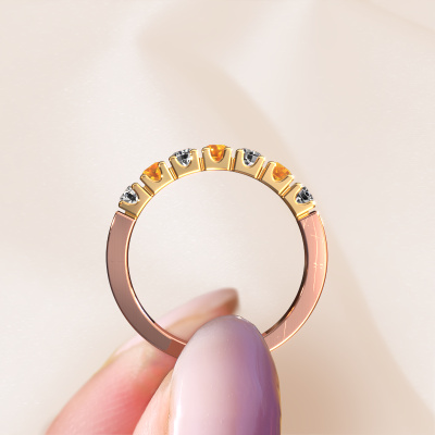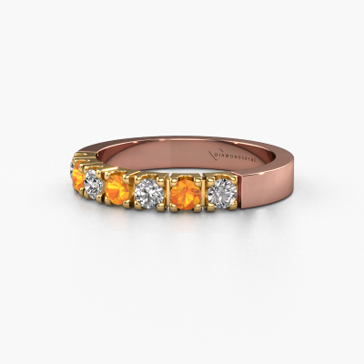 Dieser 7 Stone Ring wird Dana 7 genannt. Diese Art von Ring wird als Memoire ring bezeichnet, da seine Edelsteine in einer durchgehenden Linie angeordnet sind. Dadurch kann er einfach mit anderen Ringen kombiniert werden. Das Band dieses 14 Karat Roségold Ring ist in einer Kombination aus Citrin und Lab-grown Diamant besetzt. Sie können ganz einfach online die Kombination auswählen, die Sie bevorzugen. Wie Sie sehen, wird bei diesem Roségold Memoire Ring mehre Citrin gesetzt. Der Memoire ring steht für Zusammenwirken. Und genau das tun diese Edelsteine, zusammenwirken. Zusammen geben sie dem Band eines moderne Ring einen schönen Effekt! So ein bedeutungsvoller Ring, finden Sie nicht auch? Alle von uns ausgesuchten Citrin werden von unserem erfahrenen Goldschiede in Handarbeit eingefasst. Das ist eine präzise Aufgabe, die nur durch die Kombination von purer Handwerkskunst und dem Einsatz neuester Techniken erfolgreich durchgeführt werden kann, um eine optimale Wirkung zu erzielen. Um eine perfekte Lichtreflexion zu erzeugen, müssen alle Edelsteine auf die gleiche Weise perfekt ausgerichtet sein. Während der Fertigung wird der Goldschmied Meister daher ständig die Lichtreflexion überwachen, um zu gewährleisten, dass die Citrin perfekt ausgerichtet sind. Das erfordert eine geschickte Hand und viel Geduld, aber dann wird das Endprodukt zu einem echten Kunstwerk. Und genau das ist unsere Mission!Nach Erhalt Ihrer Bestellung beginnen unsere Goldschmiede mit Leidenschaft den kreativen Prozess und fertigen Ihren Ring in unserem eigenen Studio. Da wir keine großen Lager haben, werden diese Kosten nicht an Sie weitergegeben. Unsere Preisgestaltung ist der Beweis dafür! Wir bieten Schmuck zum niedrigsten Preis, garantiert.Unser Team von talentierten, leidenschaftlichen Designern fügt unserer Online-Kollektion täglich neue Ringe-Designs hinzu. Unser Ziel dabei ist es, Ihnen eine große Vielfalt an Schmuckstücken anbieten zu können. Bitte zögern Sie nicht, ein Angebot anzufordern, wenn Sie spezielle Wünsche für Ihren Ring haben. Wir garantieren Ihnen ein Angebot, das Sie nicht ablehnen können.Um es einfacher zu machen, bieten wir eine kostenlose 30-tägige Rücksendung.