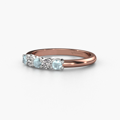 Dieser 5 Stone Ring wird Michelle 5 genannt. Diese Art von Ring wird als Memoire ring bezeichnet, da seine Edelsteine in einer durchgehenden Linie angeordnet sind. Dadurch kann er einfach mit anderen Ringen kombiniert werden. Das Band dieses 14 Karat Roségold Ring ist in einer Kombination aus Aquamarin und Lab-grown Diamant besetzt. Sie können ganz einfach online die Kombination auswählen, die Sie bevorzugen. Wie Sie sehen, wird bei diesem Roségold Memoire Ring mehre Aquamarins gesetzt. Der Memoire ring steht für Zusammenwirken. Und genau das tun diese Edelsteine, zusammenwirken. Zusammen geben sie dem Band eines klassische Ring einen schönen Effekt! So ein bedeutungsvoller Ring, finden Sie nicht auch? Alle von uns ausgesuchten Aquamarins werden von unserem erfahrenen Goldschiede in Handarbeit eingefasst. Das ist eine präzise Aufgabe, die nur durch die Kombination von purer Handwerkskunst und dem Einsatz neuester Techniken erfolgreich durchgeführt werden kann, um eine optimale Wirkung zu erzielen. Um eine perfekte Lichtreflexion zu erzeugen, müssen alle Edelsteine auf die gleiche Weise perfekt ausgerichtet sein. Während der Fertigung wird der Goldschmied Meister daher ständig die Lichtreflexion überwachen, um zu gewährleisten, dass die Aquamarins perfekt ausgerichtet sind. Das erfordert eine geschickte Hand und viel Geduld, aber dann wird das Endprodukt zu einem echten Kunstwerk. Und genau das ist unsere Mission!Haben Sie ein bestimmtes Budget? Sie können uns gerne kontaktieren, damit wir Ihre Optionen besprechen können. Wir bieten unsere Ringe zum garantiert besten Preis, denn wir fertigen sie auf Bestellung. Solche Preise finden Sie nirgendwo anders!