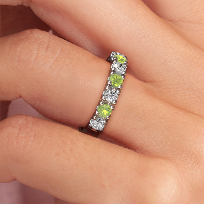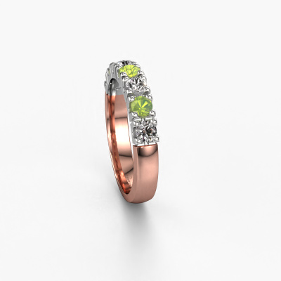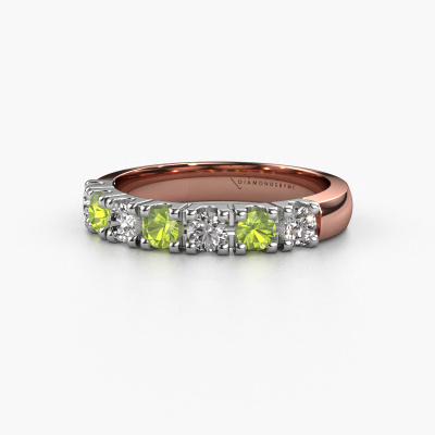 Dieser 7 Stone Ring wird Rianne 7 genannt. Diese Art von Ring wird als Memoire ring bezeichnet, da seine Edelsteine in einer durchgehenden Linie angeordnet sind. Dadurch kann er einfach mit anderen Ringen kombiniert werden. Das Band dieses 14 Karat Roségold Ring ist in einer Kombination aus Peridot und Lab-grown Diamant besetzt. Sie können ganz einfach online die Kombination auswählen, die Sie bevorzugen. Wie Sie sehen, wird bei diesem Roségold Memoire Ring mehre Peridot gesetzt. Der Memoire ring steht für Zusammenwirken. Und genau das tun diese Edelsteine, zusammenwirken. Zusammen geben sie dem Band eines traditionell Ring einen schönen Effekt! So ein bedeutungsvoller Ring, finden Sie nicht auch? Alle von uns ausgesuchten Peridot werden von unserem erfahrenen Goldschiede in Handarbeit eingefasst. Das ist eine präzise Aufgabe, die nur durch die Kombination von purer Handwerkskunst und dem Einsatz neuester Techniken erfolgreich durchgeführt werden kann, um eine optimale Wirkung zu erzielen. Um eine perfekte Lichtreflexion zu erzeugen, müssen alle Edelsteine auf die gleiche Weise perfekt ausgerichtet sein. Während der Fertigung wird der Goldschmied Meister daher ständig die Lichtreflexion überwachen, um zu gewährleisten, dass die Peridot perfekt ausgerichtet sind. Das erfordert eine geschickte Hand und viel Geduld, aber dann wird das Endprodukt zu einem echten Kunstwerk. Und genau das ist unsere Mission!Da wir unsere eigenen Ringe entwerfen und liefern, können wir Ihnen einen Ring zu einem Preis anbieten, den Sie nirgendwo anders finden. Ein Ring wird auf Bestellung angefertigt, wodurch kein überschüssiges Material anfällt. So können wir Ihnen ein gutes Angebot zum besten Preis machen. Wir verstehen, dass es sich riskant anfühlt, Ihren Ring online zu kaufen. Jedoch helfen wir Ihnen gerne beim Designprozess unter Berücksichtigung Ihres Budgets.