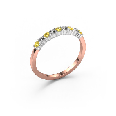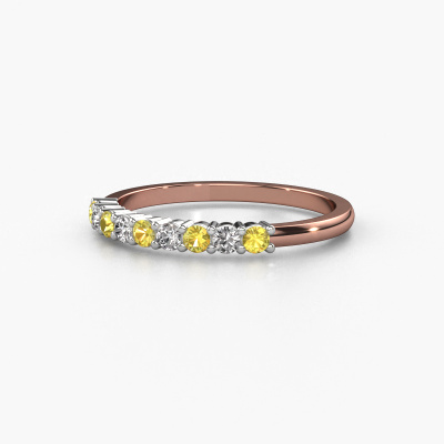 Dieser 9 Stone Ring wird Yasmin 9 genannt. Diese Art von Ring wird als Memoire ring bezeichnet, da seine Edelsteine in einer durchgehenden Linie angeordnet sind. Dadurch kann er einfach mit anderen Ringen kombiniert werden. Das Band dieses 14 Karat Roségold Ring ist in einer Kombination aus Gelb Saphir und Diamant besetzt. Sie können ganz einfach online die Kombination auswählen, die Sie bevorzugen. Wie Sie sehen, wird bei diesem Roségold Memoire Ring mehre Gelb Saphir gesetzt. Der Memoire ring steht für Zusammenwirken. Und genau das tun diese Edelsteine, zusammenwirken. Zusammen geben sie dem Band eines klassische Ring einen schönen Effekt! So ein bedeutungsvoller Ring, finden Sie nicht auch? Alle von uns ausgesuchten Gelb Saphir werden von unserem erfahrenen Goldschiede in Handarbeit eingefasst. Das ist eine präzise Aufgabe, die nur durch die Kombination von purer Handwerkskunst und dem Einsatz neuester Techniken erfolgreich durchgeführt werden kann, um eine optimale Wirkung zu erzielen. Um eine perfekte Lichtreflexion zu erzeugen, müssen alle Edelsteine auf die gleiche Weise perfekt ausgerichtet sein. Während der Fertigung wird der Goldschmied Meister daher ständig die Lichtreflexion überwachen, um zu gewährleisten, dass die Gelb Saphir perfekt ausgerichtet sind. Das erfordert eine geschickte Hand und viel Geduld, aber dann wird das Endprodukt zu einem echten Kunstwerk. Und genau das ist unsere Mission!Durch die Kombination modernster Technik mit uralter Handwerkskunst können wir alle Ringe in unserem eigenen Studio anfertigen. Jedes Schmuckstück wird auf Anfrage gefertigt. Das ist vorteilhaft, weil wir Ihnen dadurch einen Preis anbieten können, den Sie nirgendwo anders finden.Unser Team von talentierten, leidenschaftlichen Designern fügt unserer Online-Kollektion täglich neue Ring-Designs hinzu. Unser Ziel dabei ist es, Ihnen eine große Vielfalt an Schmuckstücken anbieten zu können. Bitte zögern Sie nicht, ein Angebot anzufordern, wenn Sie spezielle Wünsche für Ihren Ring haben. Wir garantieren Ihnen ein Angebot, das Sie nicht ablehnen können.Um es einfacher zu machen, bieten wir eine kostenlose 30-tägige Rücksendung.