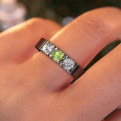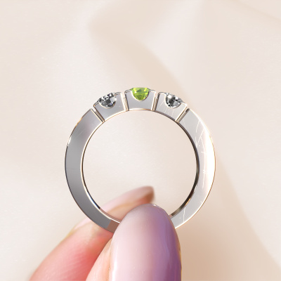 Dieser 3 Stone Ring wird Dana 3 genannt. Diese Art von Ring wird als Memoire ring bezeichnet, da seine Edelsteine in einer durchgehenden Linie angeordnet sind. Dadurch kann er einfach mit anderen Ringen kombiniert werden. Das Band dieses 14 Karat Weißgold Ring ist in einer Kombination aus Peridot und Lab-grown Diamant besetzt. Sie können ganz einfach online die Kombination auswählen, die Sie bevorzugen. Wie Sie sehen, wird bei diesem Weißgold Memoire Ring mehre Peridot gesetzt. Der Memoire ring steht für Zusammenwirken. Und genau das tun diese Edelsteine, zusammenwirken. Zusammen geben sie dem Band eines moderne Ring einen schönen Effekt! So ein bedeutungsvoller Ring, finden Sie nicht auch? Alle von uns ausgesuchten Peridot werden von unserem erfahrenen Goldschiede in Handarbeit eingefasst. Das ist eine präzise Aufgabe, die nur durch die Kombination von purer Handwerkskunst und dem Einsatz neuester Techniken erfolgreich durchgeführt werden kann, um eine optimale Wirkung zu erzielen. Um eine perfekte Lichtreflexion zu erzeugen, müssen alle Edelsteine auf die gleiche Weise perfekt ausgerichtet sein. Während der Fertigung wird der Goldschmied Meister daher ständig die Lichtreflexion überwachen, um zu gewährleisten, dass die Peridot perfekt ausgerichtet sind. Das erfordert eine geschickte Hand und viel Geduld, aber dann wird das Endprodukt zu einem echten Kunstwerk. Und genau das ist unsere Mission!Nach Erhalt Ihrer Bestellung beginnen unsere Goldschmiede mit Leidenschaft den kreativen Prozess und fertigen Ihren Ring in unserem eigenen Studio. Da wir keine großen Lager haben, werden diese Kosten nicht an Sie weitergegeben. Unsere Preisgestaltung ist der Beweis dafür! Wir bieten Schmuck zum niedrigsten Preis, garantiert.Unsere talentierten, leidenschaftlichen Designer fügen unserer Online-Kollektion täglich neue Designs hinzu. Zusammen versuchen sie, eine vielfältige Kollektion feinster Schmuckstücke zu erstellen. Wenn Sie es vorziehen, einen Ring nach Ihrem eigenen Entwurf zu machen, können Sie gerne ein Angebot anfordern. Wir machen Ihnen ein großartiges Angebot, basierend auf Qualität und Preis.Um es einfacher zu machen, bieten wir eine kostenlose 30-tägige Rücksendung.