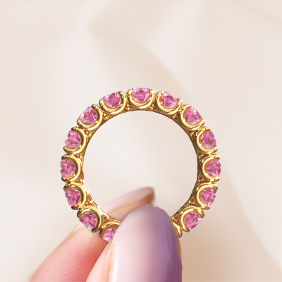 Dieser Estee 4.2 Ring in 14 Karat Gold ist mit Pink Saphir besetzt. Dieser Gold Estee 4.2 Ring ist die perfekte Ergänzung zu Ihrer Ring-Kollektion! Wie der Name schon sagt, ist es ein Ring, der an einem Finger mit einem anderen Ring kombiniert werden kann. Das gibt Ihnen die Möglichkeit, Ihren eigenen Stil zu schaffen. Ein Ring repräsentiert normalerweise eine bestimmte Erinnerung an jemand Besonderen, oder an einen denkwürdigen Moment. Es ist üblich, einen Ring, welcher ein Jubiläum darstellt, mit einem Trauring zu kombinieren. Aber dieser eternity Ring, kombiniert mit Ihren anderen Ringen, ist auch ein klassisches Modeobjekt. Der eternity Estee 4.2 Ring, wie hier abgebildet, kann ganz nach Ihren Wünschen gestaltet werden. Unser Online-Tool bietet viele verschiedene Möglichkeiten. Bitte kontaktieren Sie uns, wenn Sie Änderungen an Ihrem Estee 4.2 Ring wünschen, die in unserem Online-Tool nicht verfügbar sind.Nach Erhalt Ihrer Bestellung beginnen unsere Goldschmiede mit Leidenschaft den kreativen Prozess und fertigen Ihren Ring in unserem eigenen Studio. Da wir keine großen Lager haben, werden diese Kosten nicht an Sie weitergegeben. Unsere Preisgestaltung ist der Beweis dafür! Wir bieten Schmuck zum niedrigsten Preis, garantiert.Um es einfacher zu machen, bieten wir eine kostenlose 30-tägige Rücksendung.