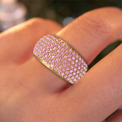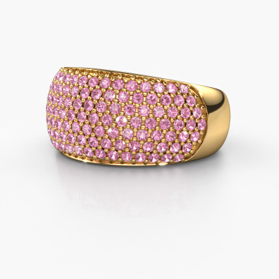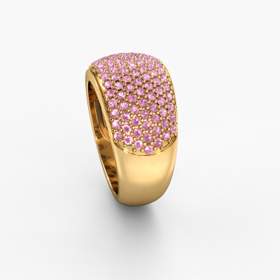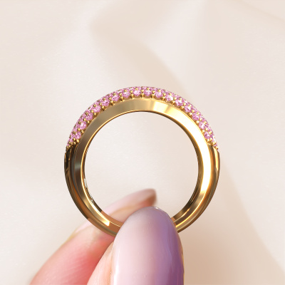 Dieser Ring mit Pavé-Fassung wird Kati genannt. Dieser Ring aus 14 Karat Gold ist komplett rund mit Pink Saphir 1.3 mm besetzt. Das Band dieses Gold Ring ist mit Reihen von Pink Saphir besetzt, die weder Anfang noch Ende zu haben scheinen. Unser Goldschiede wählt die Edelsteine sorgfältig aus und setzt sie mit höchster Präzision. Für maximalen Glanz müssen die Pink Saphir perfekt ausgerichtet sein. Beim kunstvollen Fertigen und Polieren des Schmucks wird der Lichteinfall ständig überwacht, bis der Goldschmiedemeister mit dem Ergebnis zufrieden ist. Von Ihnen entworfen, speziell für Sie gefertigt!Sobald Sie Ihren Kati Ring mit unserem Online-Tool fertiggestellt haben, beginnen unsere Goldschmiede mit der kreativen Anfertigung Ihres Ringes. Dieser wird mit Leidenschaft und Sorgfalt nach alter Handwerkskunst gefertigt. Darüber arbeiten wir mit ehrlichen Edelsteinen. Einfach online mit unserem Online-Tool anpassen, wenn Sie Änderungen wünschen. Wenn Sie spezielle Änderungen an Ihrem Kati Gold Ring vornehmen möchten, die in unserem Online-Tool nicht verfügbar sind, wenden Sie sich bitte an unsere Experten.Nach Erhalt Ihrer Bestellung beginnen unsere Goldschmiede mit Leidenschaft den kreativen Prozess und fertigen Ihren Ring in unserem eigenen Studio. Da wir keine großen Lager haben, werden diese Kosten nicht an Sie weitergegeben. Unsere Preisgestaltung ist der Beweis dafür! Wir bieten Schmuck zum niedrigsten Preis, garantiert.Um es einfacher zu machen, bieten wir eine kostenlose 30-tägige Rücksendung.