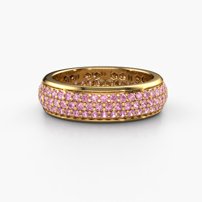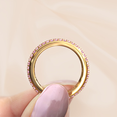 Das ist unser Tara-Ring. Dieser spezielle Typ wird als eternity Ring bezeichnet und ist mit einer durchgehenden Linie von identisch geschliffenen Edelsteinen besetzt. Er ist aus 14 Karat Gold und mit kleineren 1.3 mm Pink Saphir besetzt. Die erstaunlichen Pink Saphir sind identisch in der Größe und im Ringband platziert. Unsere Pink Saphir werden sorgfältig ausgewählt, damit sie identisch sind und somit das beste Ergebnis erzielen. Um das beste Ergebnis zu erzielen, positioniert unser Juwelier alle Pink Saphir von Hand und mit größter Sorgfalt. Unsere Juweliere haben nur ein Ziel, nämlich den perfekten Ring zu kreieren. Deshalb lieben wir, was wir tun. Am Ende bekommen Sie einen atemberaubenden, exklusive Gold Ring mit einer Reihe von Pink Saphir, die weder Anfang noch Ende zu haben scheinen. Das perfekte Symbol für Ihre unsterbliche Liebe zu ihr! Ist sie nicht eine Schönheit? Nachdem Sie Ihre Bestellung aufgegeben haben, beginnen unsere Goldschmiede mit dem kreativen Prozess der Herstellung Ihres Tara Ring. Wir haben keine Lager. Das ist vorteilhaft, da diese Kosten nicht an Sie weitergegeben werden. Daher sind wir in der Lage, Schmuck zu außergewöhnlich niedrigen Preisen anzubieten.