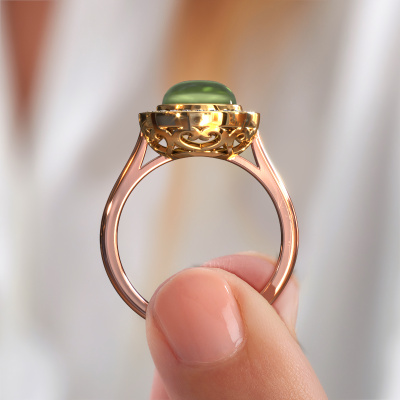 Suchen Sie einen reiche Ring mit einem auffälligen,einzelnen Edelstein? Wie gefällt Ihnen dieser Alisa Ring? Dieser Roségold Alisa Ring ist mit einem wunderschönen 8 mm rund cabochon Peridot besetzt. Der Peridot wird von unseren Peridot-Lieferanten sorgfältig ausgewählt. Anschließend werden diese Edelsteine nach alter Tradition von unserem Goldschiede gesetzt. Der Ring wird dann zur Perfektion poliert und zu einem einzigartigen Ring mit einem atemberaubenden Peridot. Speziell für Sie angefertigt. Ein individueller, Fantasie reiche Ring ist das perfekte Geschenk! Unser Team von leidenschaftlichen Goldschmieden fügt täglich neue exquisite Designs hinzu. Und jedes Design kann angepasst werden. Passen Sie zum Beispiel einfach die Edelmetalle und die Farbe der verwendeten Edelsteine an. Das macht Ihr Design des Fantasie Alisa Ring wirklich einzigartig!Haben Sie ein bestimmtes Budget? Sie können uns gerne kontaktieren, damit wir Ihre Optionen besprechen können. Wir bieten unsere Ringe zum garantiert besten Preis, denn wir fertigen sie auf Bestellung. Solche Preise finden Sie nirgendwo anders!Um es einfacher zu machen, bieten wir eine kostenlose 30-tägige Rücksendung.