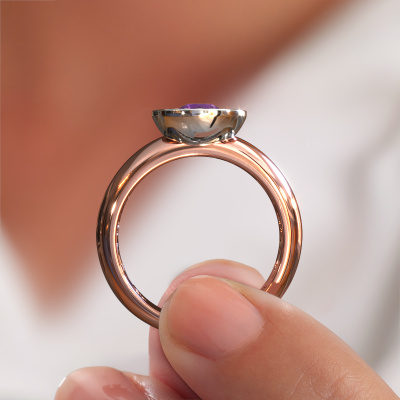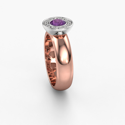 Der oben gezeigte Ring wird Anna genannt. Diese Art von Ring wird als Halo Ring bezeichnet. Der 14 Karat Roségold Ring ist mit einem 5 mm rund Amethyst als Mittelstein besetzt, umgeben von kleineren Diamanten. Dieser Halo Roségold Halo Ring ist mit einem großen Amethyst besetzt, umschlossen von kleineren Edelsteinen. Der Ring erhielt seinen Namen wegen seinem Lichthof, den die kleineren Diamanten helfen zu schaffen. Um einen umwerfenden Lichthof zu erhalten, müssen diese kleineren Edelsteine perfekt ausgerichtet sein, damit das Licht aus jedem Blickwinkel gleichmäßig auf den Amethyst reflektiert wird. Und unsere erfahrenen Goldschmiede erledigen diese Arbeit. Jedes sorgfältig ausgewählte Amethyst wird von Hand und mit höchster Präzision gesetzt. Während der Herstellung wird der Lichteinfall ständig überwacht, um sicherzustellen, dass der Halo Halo-Effekt noch sichtbar ist. Am Ende erhalten Sie einen einzigartigen Ring mit einem strahlenden Amethysten Edelstein-Herzstück. Ein wahrlich exquisiter Ring!Der Halo Anna Ring, wie hier abgebildet, kann ganz nach Ihren Wünschen gestaltet werden. Unser Online-Tool bietet viele verschiedene Möglichkeiten. Bitte kontaktieren Sie uns, wenn Sie Änderungen an Ihrem Anna Ring wünschen, die in unserem Online-Tool nicht verfügbar sind.Haben Sie ein bestimmtes Budget? Sie können uns gerne kontaktieren, damit wir Ihre Optionen besprechen können. Wir bieten unsere Ringe zum garantiert besten Preis, denn wir fertigen sie auf Bestellung. Solche Preise finden Sie nirgendwo anders!Um es einfacher zu machen, bieten wir eine kostenlose 30-tägige Rücksendung.