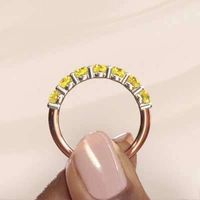 Dieser Ring wird Heddy Half genannt. Er besteht aus 14 Karat Roségold und ist mit 3.7 mm Gelb Saphir besetzt. Suchen Sie nach einem einzigartigen Roségold Ring mit modernem Aussehen? Dann ist das der perfekte Ring für Sie. Einfach nach Ihren Wünschen anpassen. Perfekt für eine moderne, zeitgenössische Frau! Dieser Memoire Ring ist mit atemberaubenden Gelb Saphir geschmückt. Er wurde sorgfältig ausgewählt, weil Ihr Ring nur mit den schönsten Edelsteinen gekrönt sein soll. Unser erfahrener Goldschiede kreiert Ihren Ring in unserem eigenen Studio, wo der Gelb Saphir mit großer Sorgfalt gesetzt wird. Der Ring wird dann perfekt poliert, um einen schönen Ring zu erhalten. Haben Sie ein bestimmtes Budget? Sie können uns gerne kontaktieren, damit wir Ihre Optionen besprechen können. Wir bieten unsere Ringe zum garantiert besten Preis, denn wir fertigen sie auf Bestellung. Solche Preise finden Sie nirgendwo anders!Unser Team von talentierten, leidenschaftlichen Designern fügt unserer Online-Kollektion täglich neue Ring-Designs hinzu. Unser Ziel dabei ist es, Ihnen eine große Vielfalt an Schmuckstücken anbieten zu können. Bitte zögern Sie nicht, ein Angebot anzufordern, wenn Sie spezielle Wünsche für Ihren Ring haben. Wir garantieren Ihnen ein Angebot, das Sie nicht ablehnen können.Um es einfacher zu machen, bieten wir eine kostenlose 30-tägige Rücksendung.