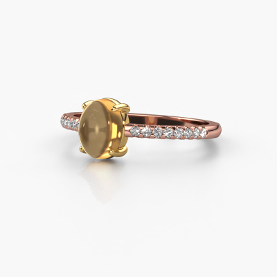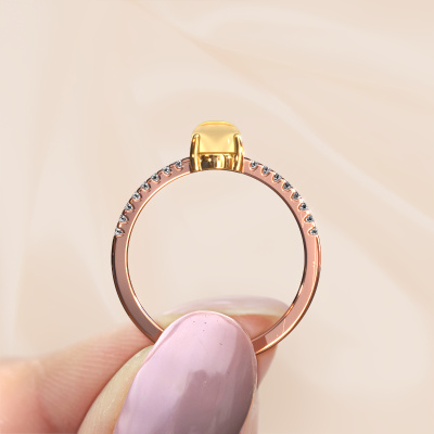 In diesem Foto ist der Roségold Becky Ring mit einem 7x5 mm oval cabochon Citrin besetzt. Cabochon bedeutet, dass ein Citrin zuerst geformt, nicht facettiert wird. Nämlich in eine bestimmte Form wie einen Tropfen, ein Herz oder ein oval cabochon. Anschließend wird er poliert, bis der Edelstein eine Runde Oberfläche hat. Ein Cabochon-Edelstein ist ein atemberaubender, nobler Blickfang, der perfekt zu einem zeitgenössischen wie auch zu einem Vintage-Stil passt. Unsere erfahrenen Goldschmiede formen den Edelsteine Ring bis zur Perfektion und machen ihn einzigartig. Der Cabochon Citrin ist so gefasst, dass seine einzigartigen Qualitäten verstärkt werden. Wie gefällt Ihnen dieser Fantasie Roségold Ring? Passen Sie diesen Becky Ring einfach mit unserem Online-Tool an. Anschließend wird Ihr persönlicher, Edelsteine Becky Ring in Handarbeit von unseren Goldschmieden angefertigt. Edelmetalle und Edelsteine können nach Ihren Wünschen angepasst werden. Haben Sie spezielle Wünsche, die in unserem Online-Tool nicht verfügbar sind? Setzen Sie sich mit uns in Verbindung. Wir passen Ihren persönlichen Fantasie Ring nach Ihren Wünschen an.Durch die Kombination modernster Technik mit uralter Handwerkskunst können wir alle Ringe in unserem eigenen Studio anfertigen. Jedes Schmuckstück wird auf Anfrage gefertigt. Das ist vorteilhaft, weil wir Ihnen dadurch einen Preis anbieten können, den Sie nirgendwo anders finden.Um es einfacher zu machen, bieten wir eine kostenlose 30-tägige Rücksendung.