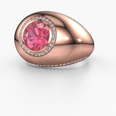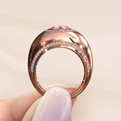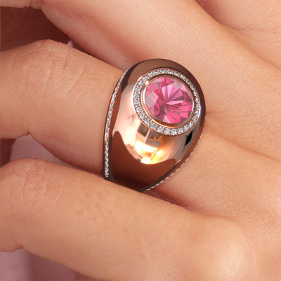Das ist ein atemberaubender, Edelsteine Roségold Roxann Ring. Er ist mit Pink Saphir besetzt. Ein Designer-Ring, passend für noble Frauen. Der Ring wurde von unseren eigenen Goldschmieden entworfen. In unserem Atelier verwenden wir eine